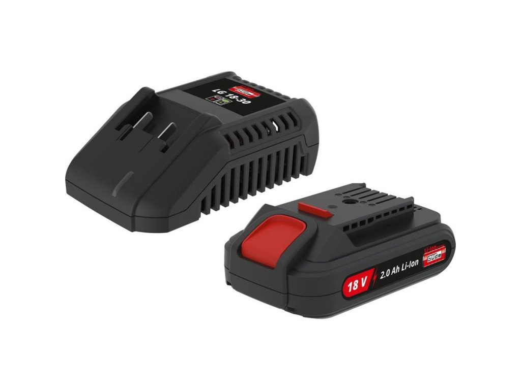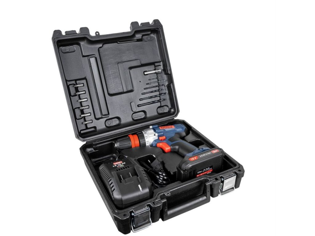 Vybavení: Li-Ion akumulátor 18 V/2,0 Ah; nabíječka 3,0 A/h; sada vrtáků, 6dílná (HSS; pr. 1,5-2,5-3,0-4,0-5,0-6,0 mm); sada bitů, 6dílná (Cr-V; pr. 5-6 mm, PH1, PH2, PZ1, PZ2); plastový transportní kufřík.
