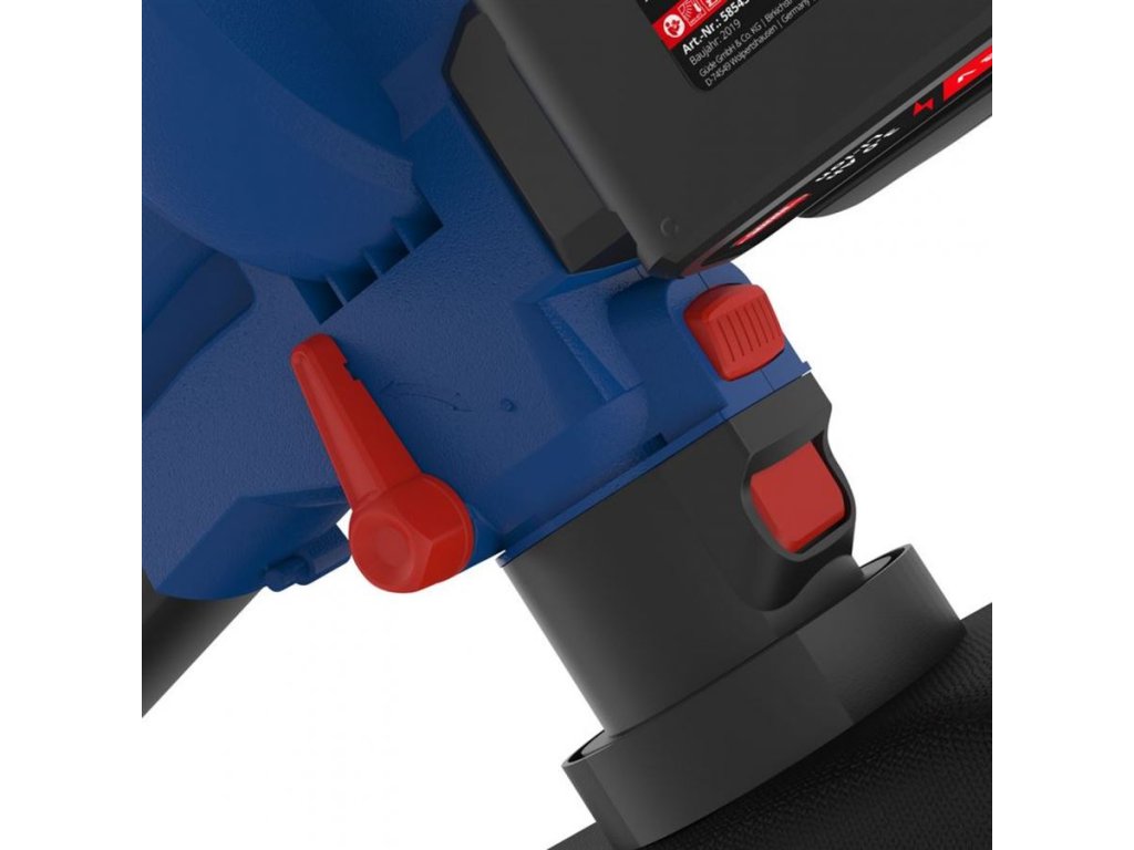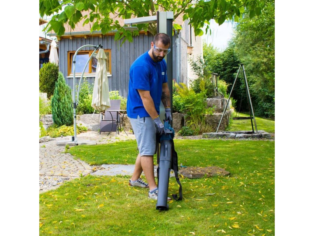 Výkonný akumulátorový vysavač GÜDE, určený k odstranění drobného rostlinného odpadu ze zahradních trávníků i zpevněných ploch okolo domu.