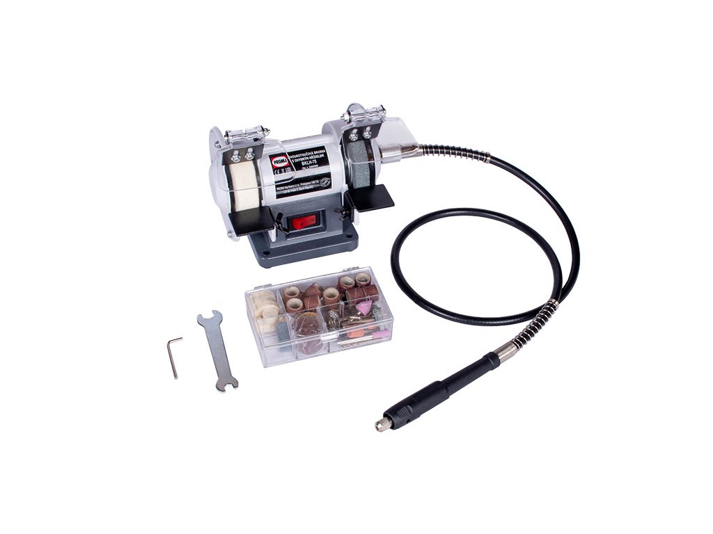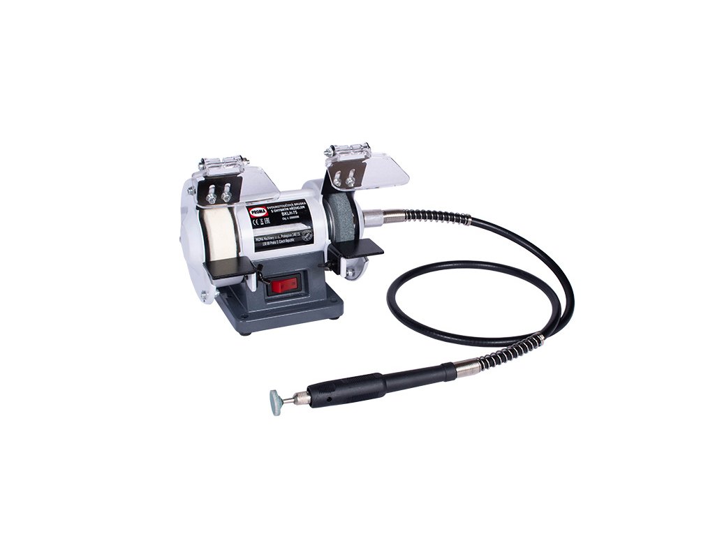BKLH-75 - Dvoukotoučová bruska s ohebnou hřídelí její ideální použití ocení v domácnosti, každý kutil , modelář i nejnáročnější hobby uživatel. Je určena pro drobné brousící práce a leštění. Přídavná ohebná hřídel umožňuje použití širokého výběru 3,2mm brusných a řezných tělísek určených k jemnému gravírování, preciznímu opracování dřeva, plastu, kovu nebo skla.