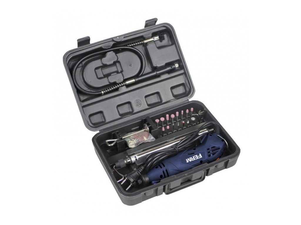 CTM1017 - Přímá bruska 160W je malá bruska s řadou nástavců, určená k jemným gravírovacím pracím, preciznímu opracování dřeva, kovu či plastů a práci ve stísněných prostorech. Má ergonomický tvar a je pokrytá gumou v místech úchopu, což snižuje únavu při práci. Stroj umožňuje výměnu a montáž upínacích kleštin pro uchycení nástrojů s průměrem stopky 3 nebo 3,2 mm. Součástí balení je sada 40 kusů brusných a řezacích nástrojů a nástavců. Pro velmi jemnou a drobnou práci je u brusky ohebný nástavec.