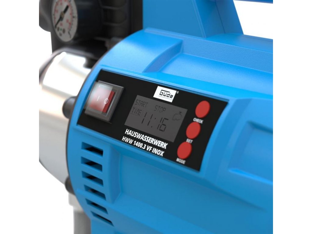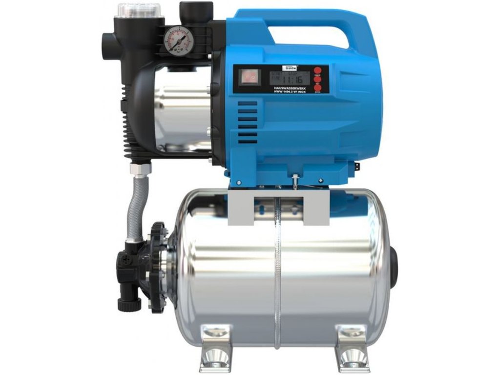 Elektronicky řízená domácí vodárna Güde, určená k čerpání (čisté) užitkové vody za účelem zásobování domácnosti nebo zavlažování zahrady.