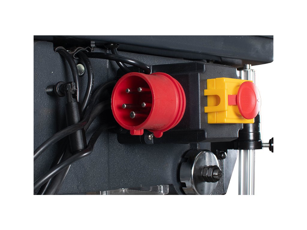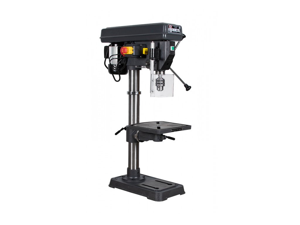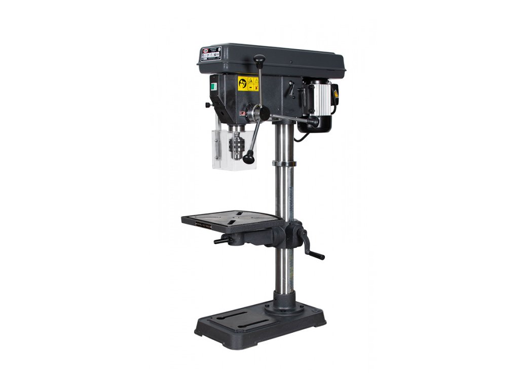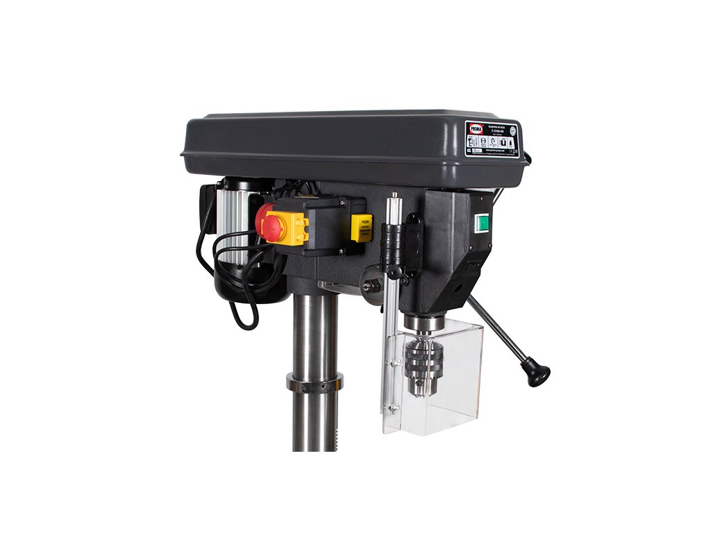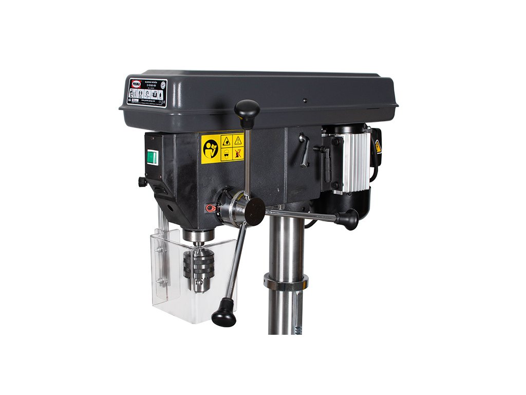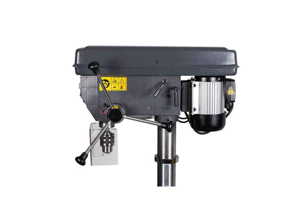 Stojanová vrtačka E-1516B/400, stroj táto třídy vyniká řadou nadstandardních funkcí a možnostmi, které uživatelům přinášejí vysokou užitnou hodnotu. Je konstruován pro vrtání, zahlubování a vystružování. Vhodné využití najde v zámečnických dílnách, opravárenských podnicích, truhlárnách, skladech ale i u domácích kutilů. Vřeteno je uloženo v kuličkových ložiscích a osazena kuželem Mk II, do kterého je možné vložit vrtací sklíčidlo nebo přímo nástroj. Pracovní stůl lze natáčet až o 360° pomocí otočného čepu a naklápět do úhlu + / - 45° od základní roviny, což umožňuje vrtání otvorů pod různými úhly.