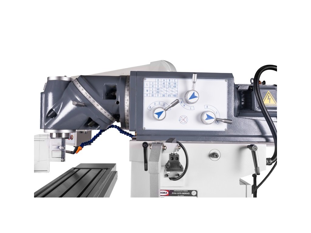 FVV-1370 Servo je výkonná univerzální frézka se zaručenou vysokou produktivitou, přesností a digitálním odměřováním určená pro širokou škálu frézovacích operací. Tuhá konstrukce zabezpečuje dostatečnou kvalitu opracování ocelových materiálů, litiny, barevných kovů a dalších materiálů v téměř všech pracovních režimech.