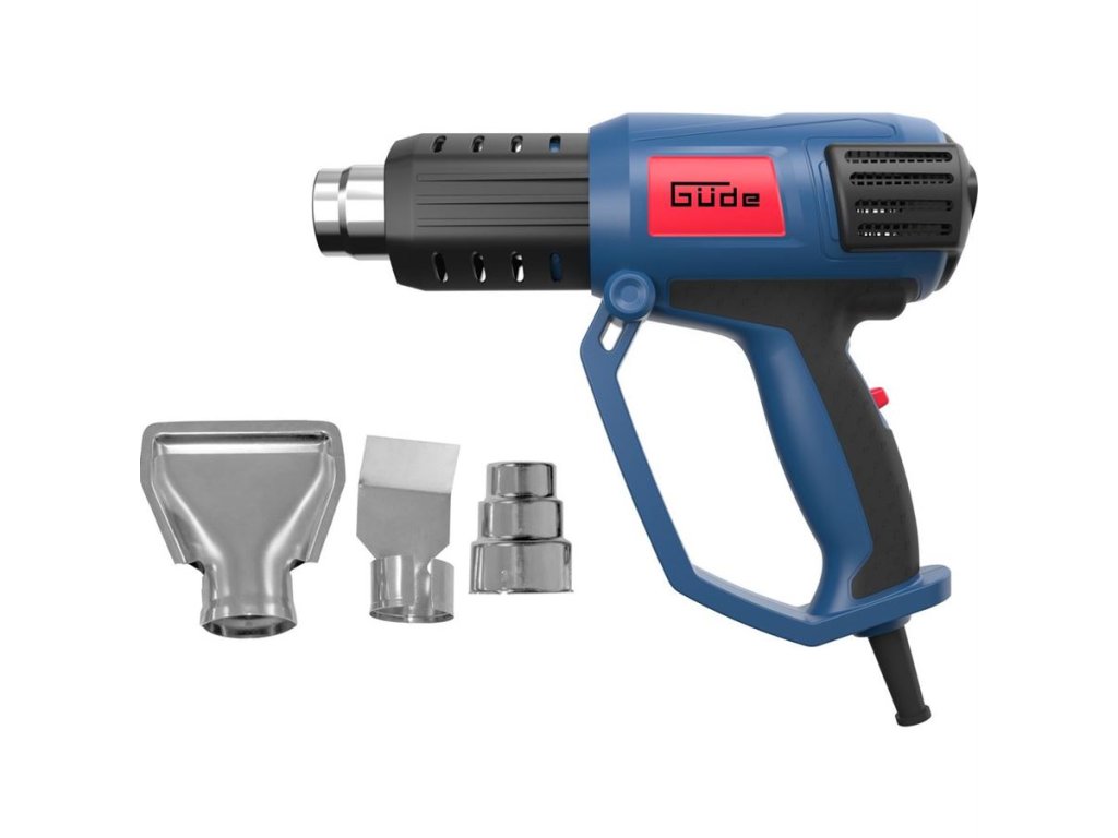 Praktická horkovzdušná pistole GÜDE s mnohostranným využitím v podmínkách domácích dílen např. odstraňování starých nátěrů, nálepek, dekorací, uvolňování zarezlých šroubů, tvarování plastů, vysoušení tmelů, rozmrazování zámků, vodovodního vedení apod.