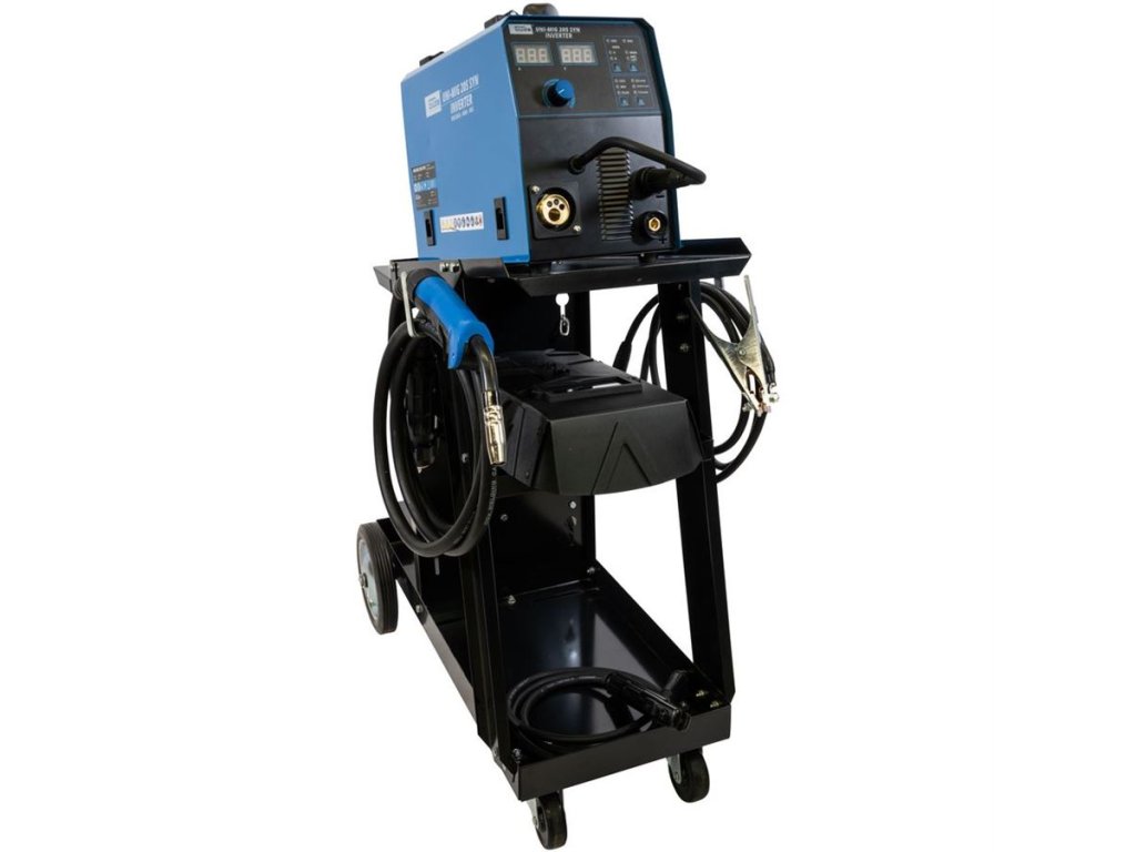 Rozsah dodávky: 3 m svařovací hořák MB 15 EURO, kabel s držákem elektrod, zemnící kabel se svorkou 300 A, drátěný kartáč s kladívkem, štít, podávací kladka, redukční ventil, sada trysek, vozík na plynovou láhev, svářečku .
