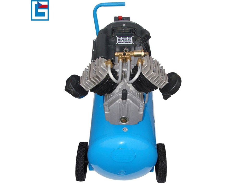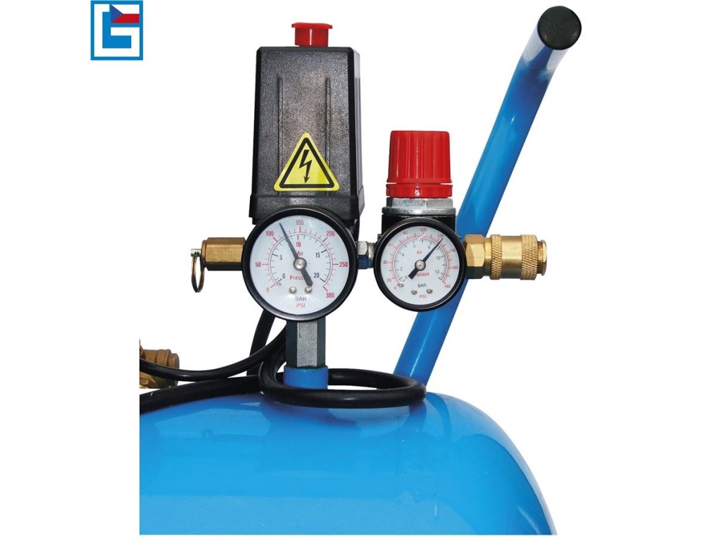 Vybavení: 2 manometry, 2 výstupy tlakového vzduchu (-> kovové rychlospojky), tlakový spínač, redukční ventil, pojistný přetlakový ventil, zpětný ventil, olejoznak, vzduchové filtry (2), 1,8 m přípojný elektrický kabel H07 RN-F.