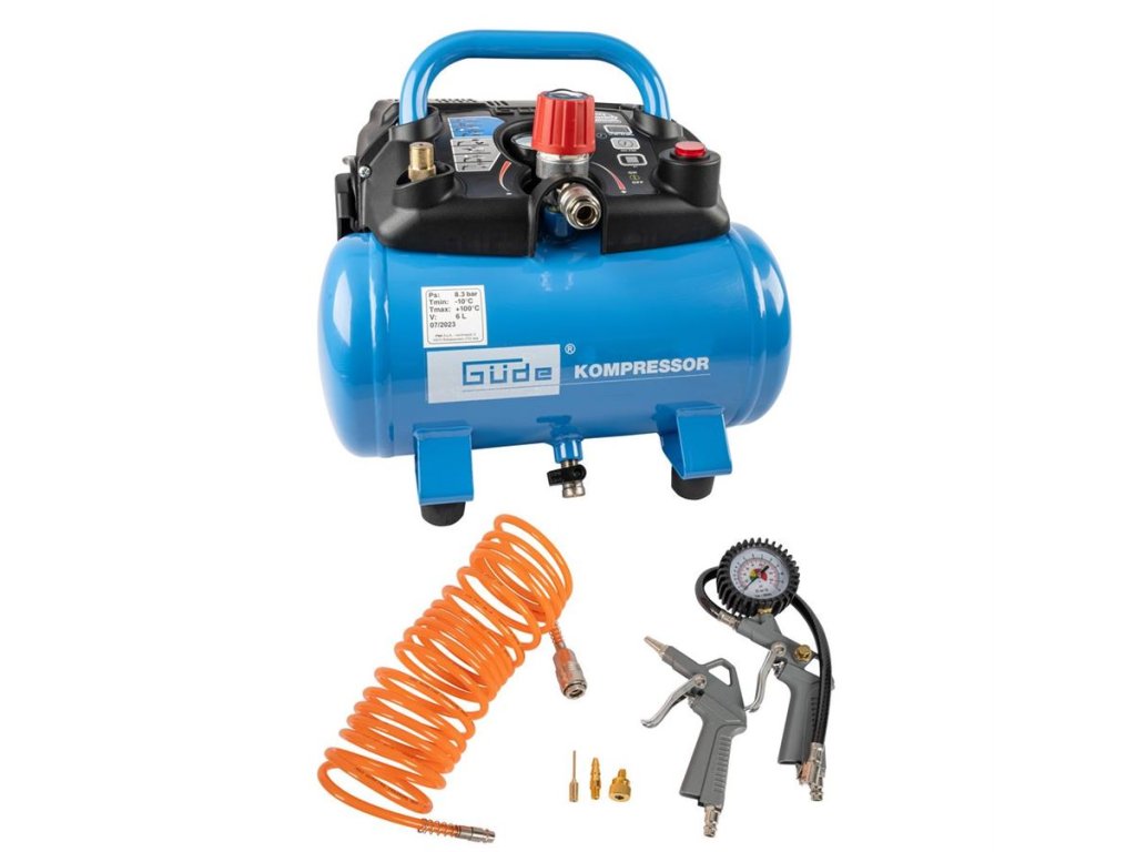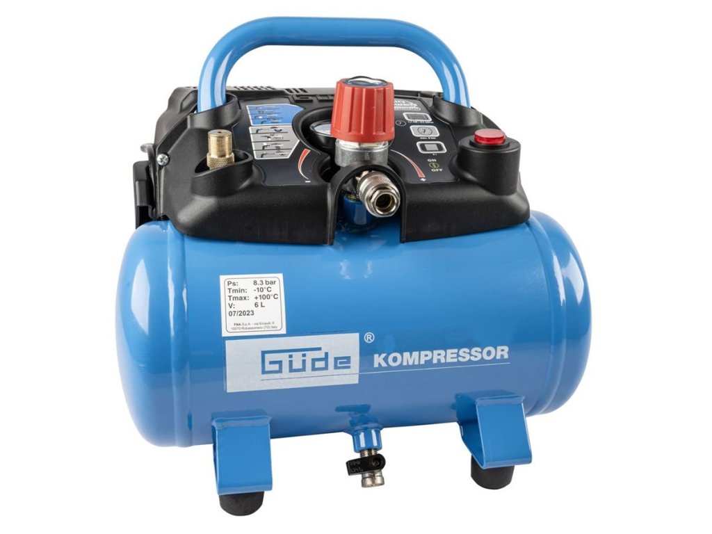Tlaková nádoba: 6 l, ventil pro vypouštění kondenzátu, opěrné nožky s gumovými patkami.
