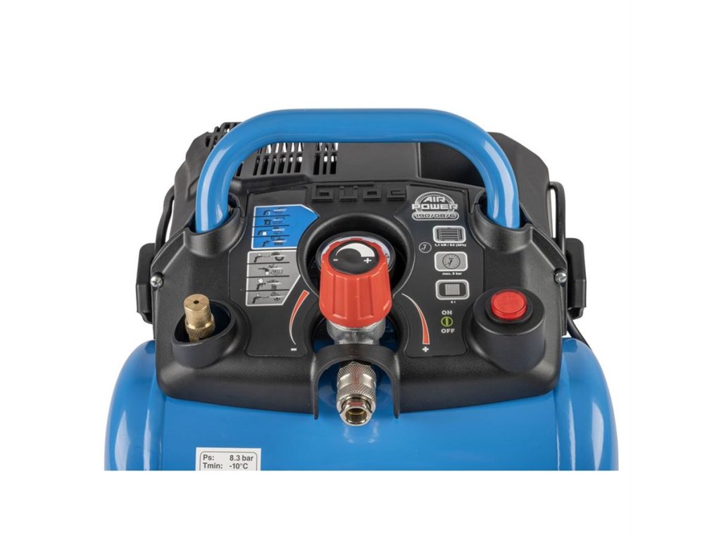 Vybavení: manometr (-> měření pracovního tlaku), 1 výstup tlakového vzduchu (-> kovová rychlospojka), tlakový spínač, pojistný přetlakový ventil, odkládací přihrádka, transportní madlo.