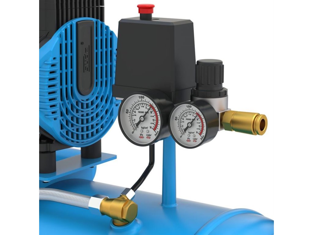 Vybavení: 2 manometry, 2 výstupy stlačeného vzduchu, tlakový spínač, redukční ventil, pojistný přetlakový ventil, zpětný ventil, vzduchový filtr.