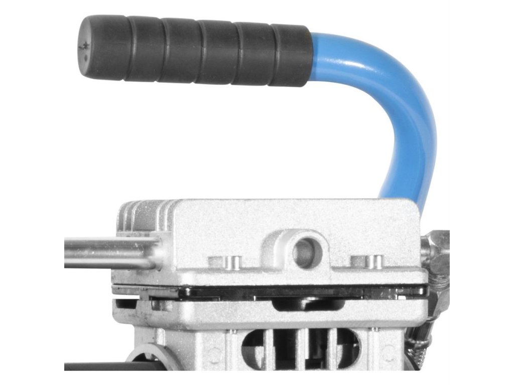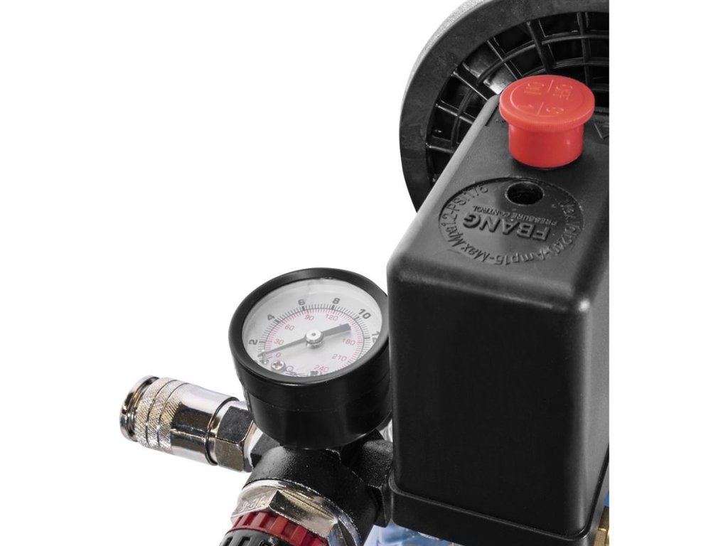 Vybavení: manometr (měření pracovního tlaku), 1 výstup stlačeného vzduchu (kovová rychlospojka), tlakový spínač, redukční ventil, pojistný přetlakový ventil, přepravní držadlo.