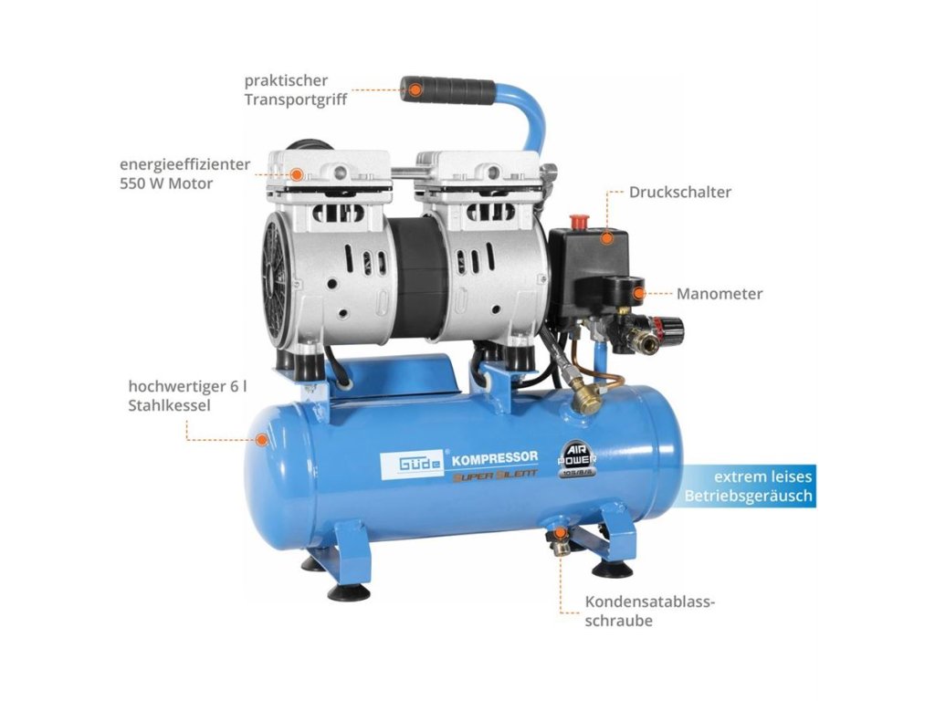 Tlaková nádoba: 6 l, ventil pro vypouštění kondenzátu, opěrné nožky s tlumicími gumovými patkami.