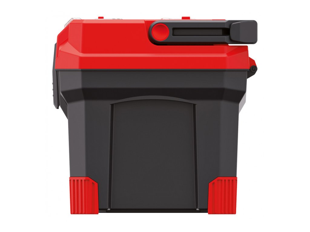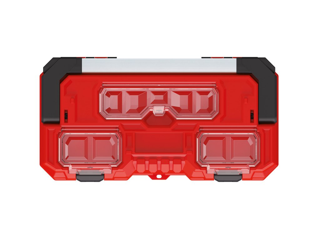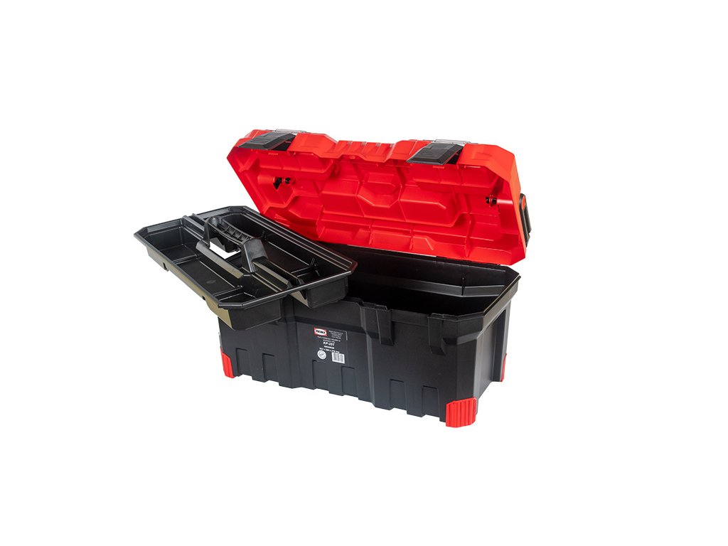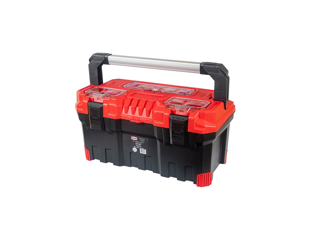 Plastový kufr na nářadí s hliníkovým držadlem a pryžovou ochranou rohů.