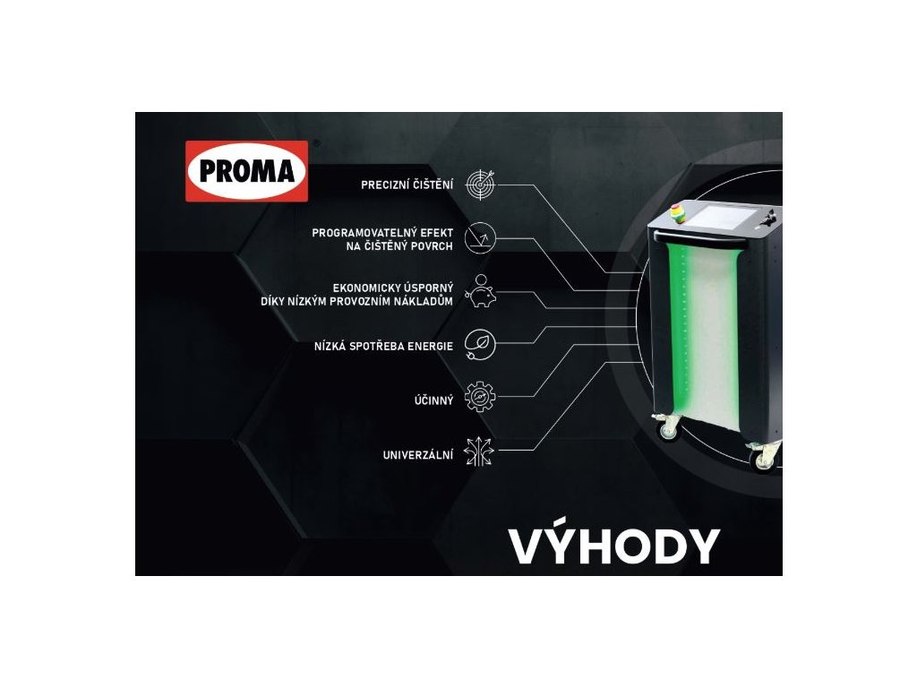 Čistící průmyslové lasery PROMA řady PPU jsou vybaveny pokročilým optickým systémem, vysoce výkonným laserovým zdrojem Trumph s životnosti 100.000 hodin, díky kterým jsou schopni čistit širokou škálu materiálů, včetně kovů, plastů, skla a keramiky.