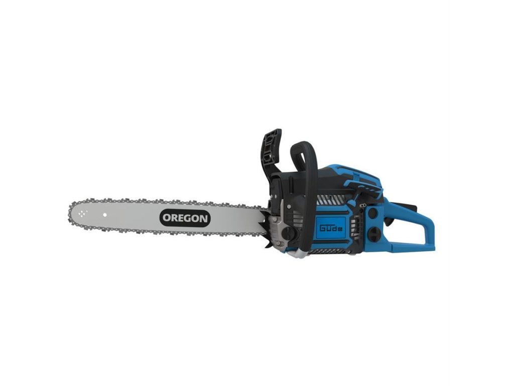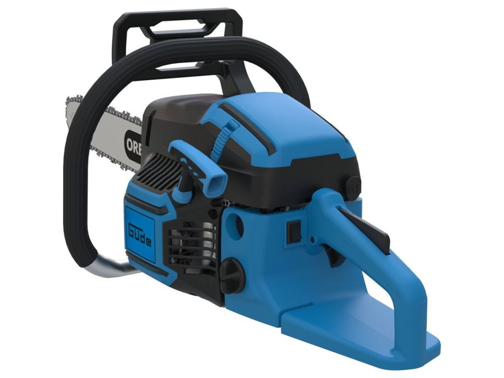 Spolehlivá benzinová pila GÜDE, určená k řezání dřeva v zahradě a okolo domu.