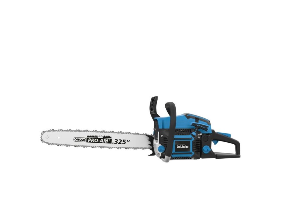 Výkonná benzinová pila GÜDE, určená k řezání dřeva v zahradě a okolo domu.