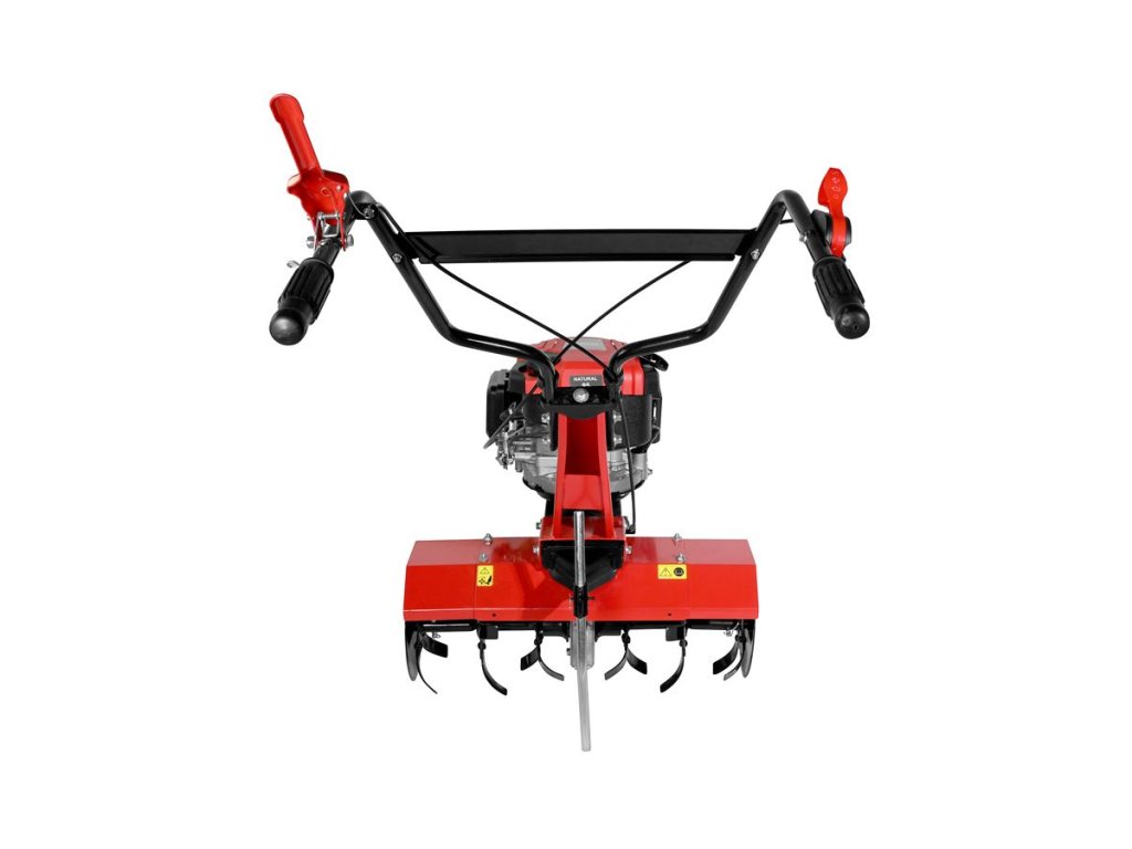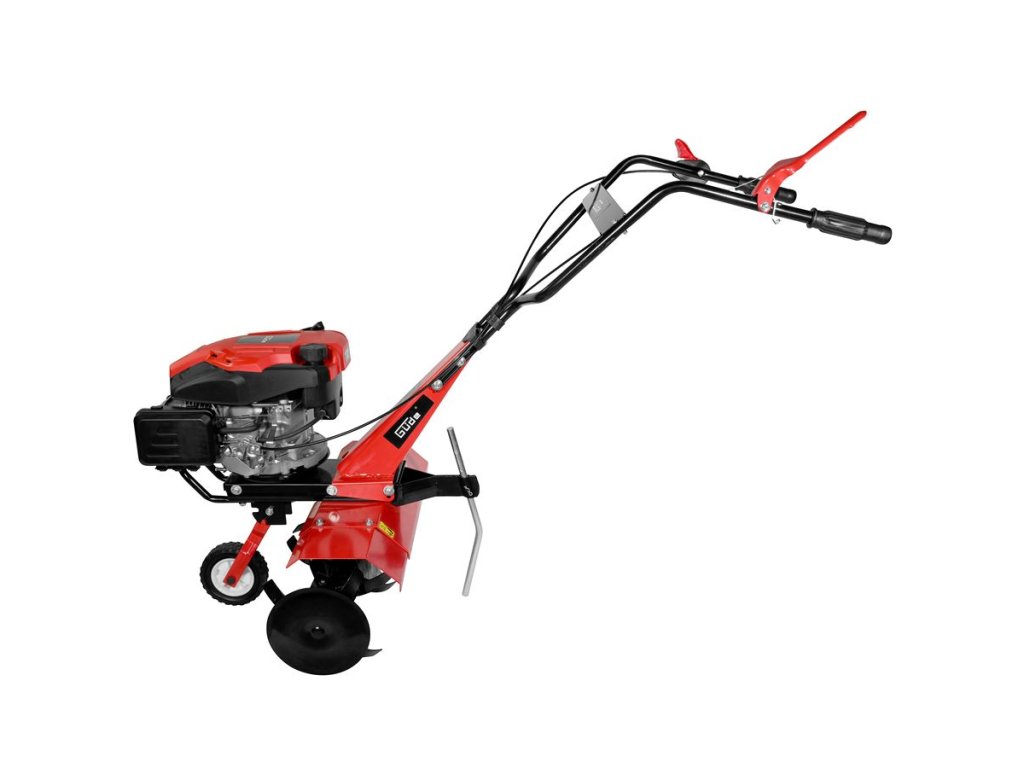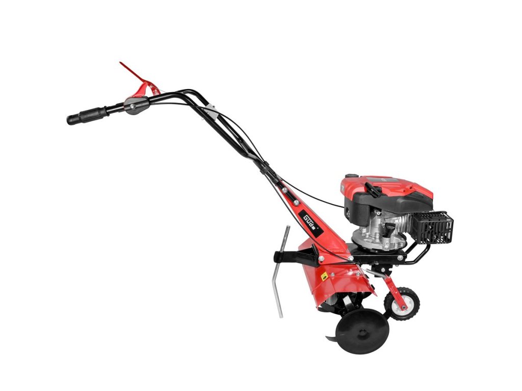 | Vybavení - funkce • zkypřování písčitých (hlinitých) půd • rozmělnění hrud • zapravení kompostu, rašeliny, substrátů, hnojiv atp. • 6 ocelových nožů ø 27 cm • 3stupňové nastavení hloubky kultivace 12,5 - 26cm • 4taktní motor • reverzní startovaccí systém • široká ergonomická řidítka • sklopné transportní kolo