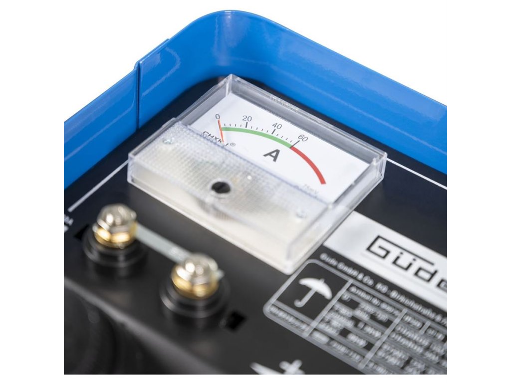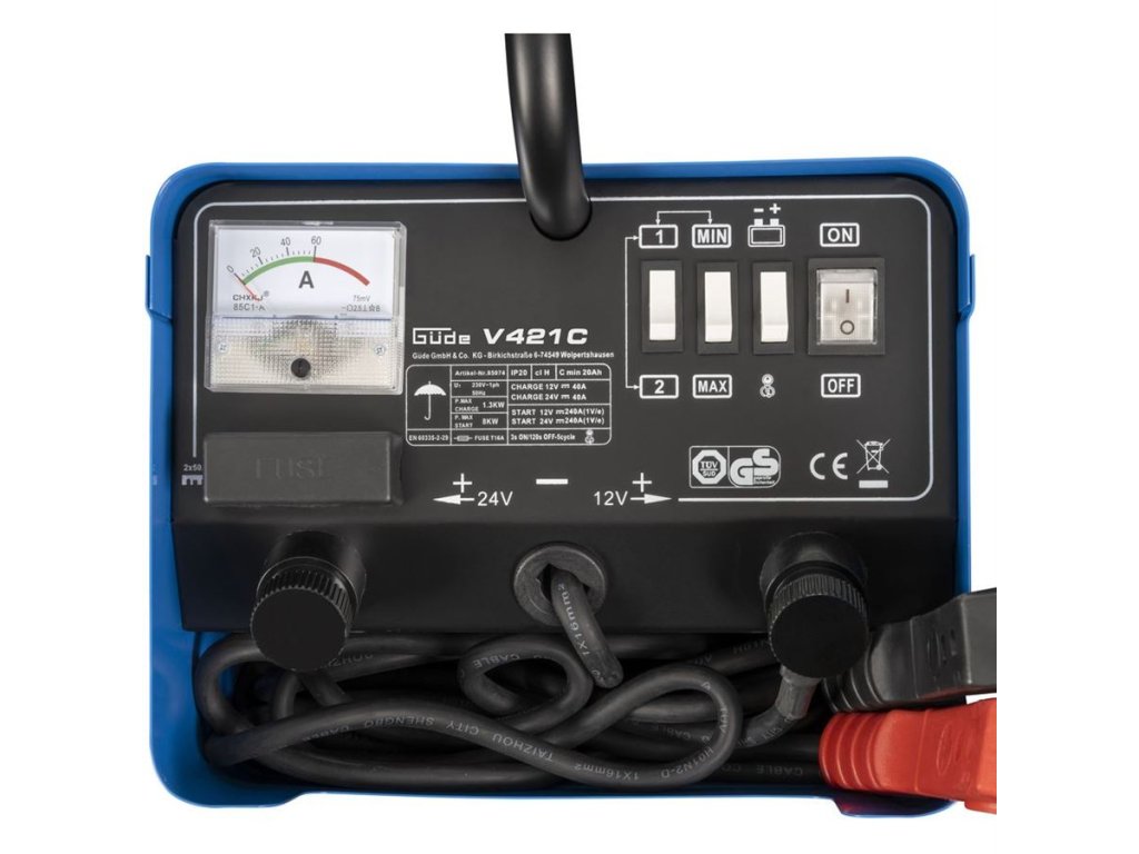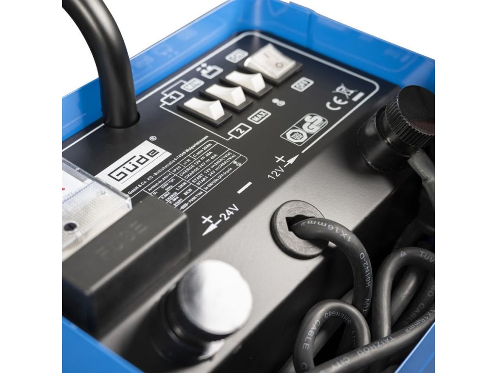 Nabíječka baterií GÜDE se startovacím zdrojem je určená ke standardnímu i rychlonabíjení akumulátorů 12 V a 24 V s kapacitou od 20 Ah do 800 Ah.