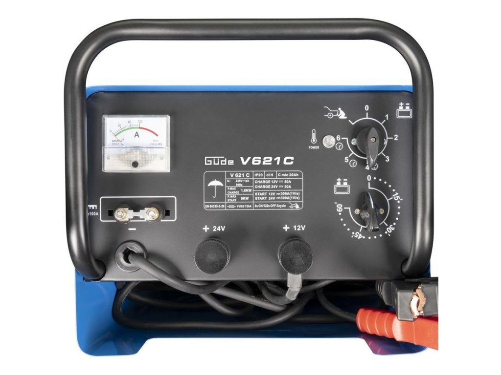 Nabíječka baterií GÜDE se startovacím zdrojem je určená ke standardnímu i rychlonabíjení akumulátorů 12 V a 24 V s kapacitou od 20 Ah do 800 Ah.