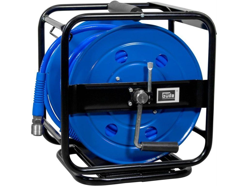 Polyuretanová tlaková hadice s textilní vložkou (→ délka: 30 m, včetně rychlospojky/vsuvky integrované do bubnu/otočných kloubů na přípojkách), manuální navíjení hadice (→ sklopná klika s aretací).
