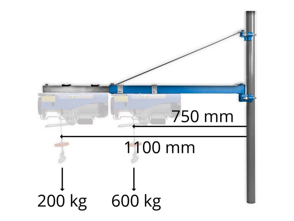 Výkyvné ocelové rameno s maximální nosností 600 kg, koncipované pro bezpečné zavěšení elektrických lanových zvedáků (→ kompatibilní s modely GSZ 100/200, GSZ 200/400, GSZ 300/600).