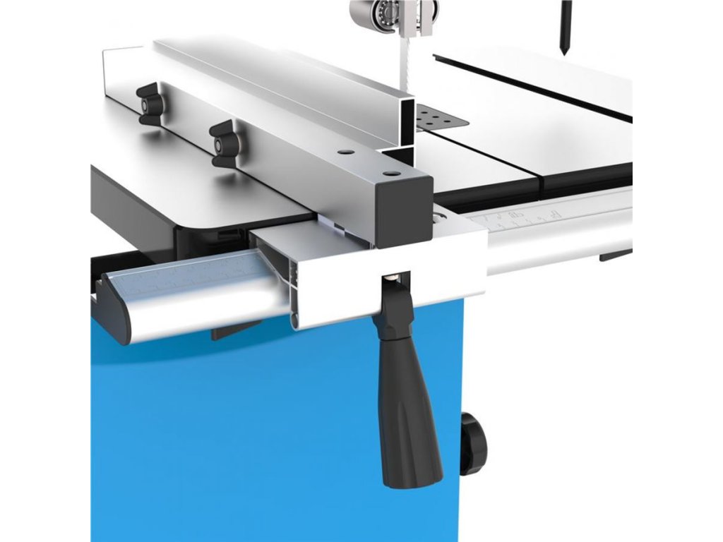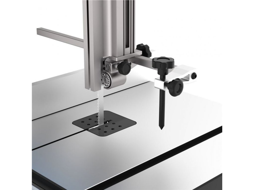 3bodová vedení pilového pásu (kuličková ložiska); rychlé seřízení výšky (vrchního) vodítka pásu podle konkrétních rozměrů obrobku; hrot pro vyřezávání kruhových ploch. Indukční motor 750 W/P1, nouzový vypínač.