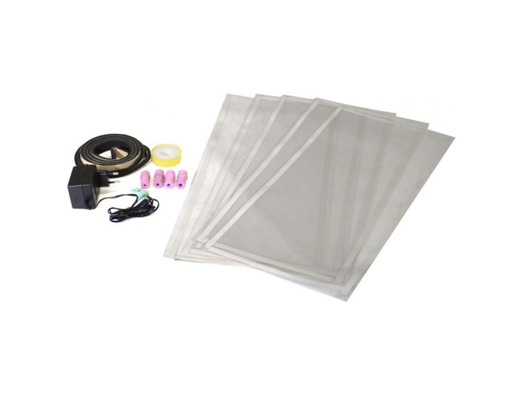 Příslušenství: sada 4 keramických trysek (Ø 4-5-6-7 mm), ochranné fólie (5), 12 V síťový adaptér, těsnicí a teflonová páska.