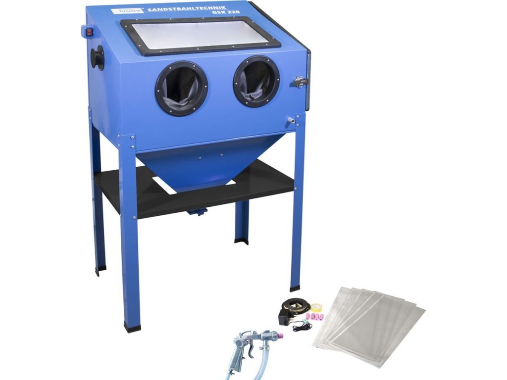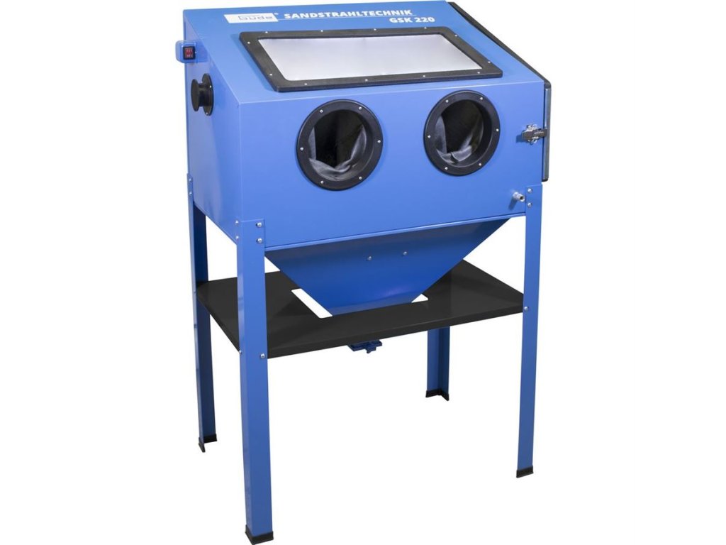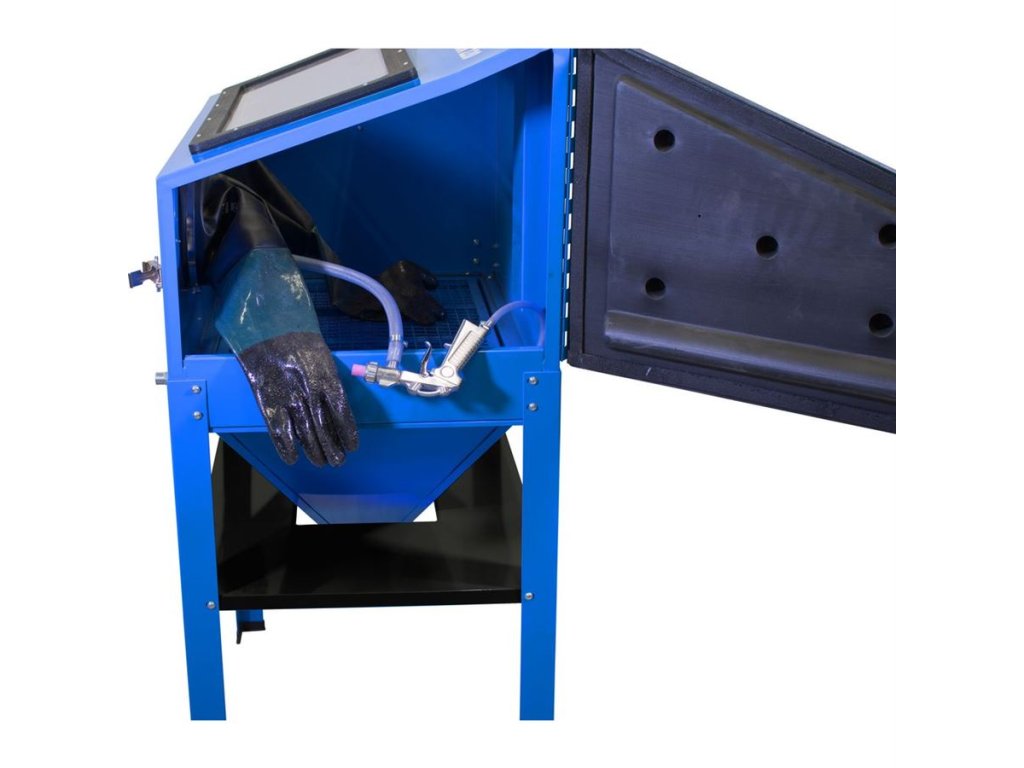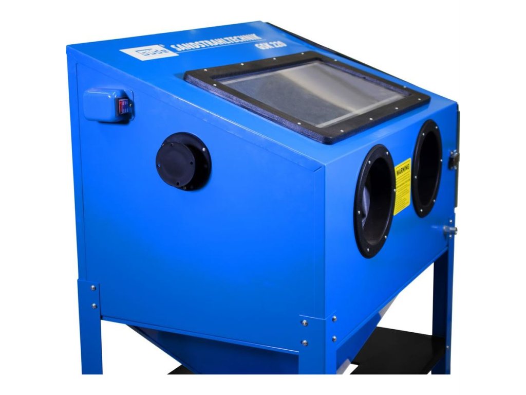Pískovací box GÜDE, určený k čištění nebo úpravám povrchu menších (středně velkých) předmětů proudem abrazivního materiálu.