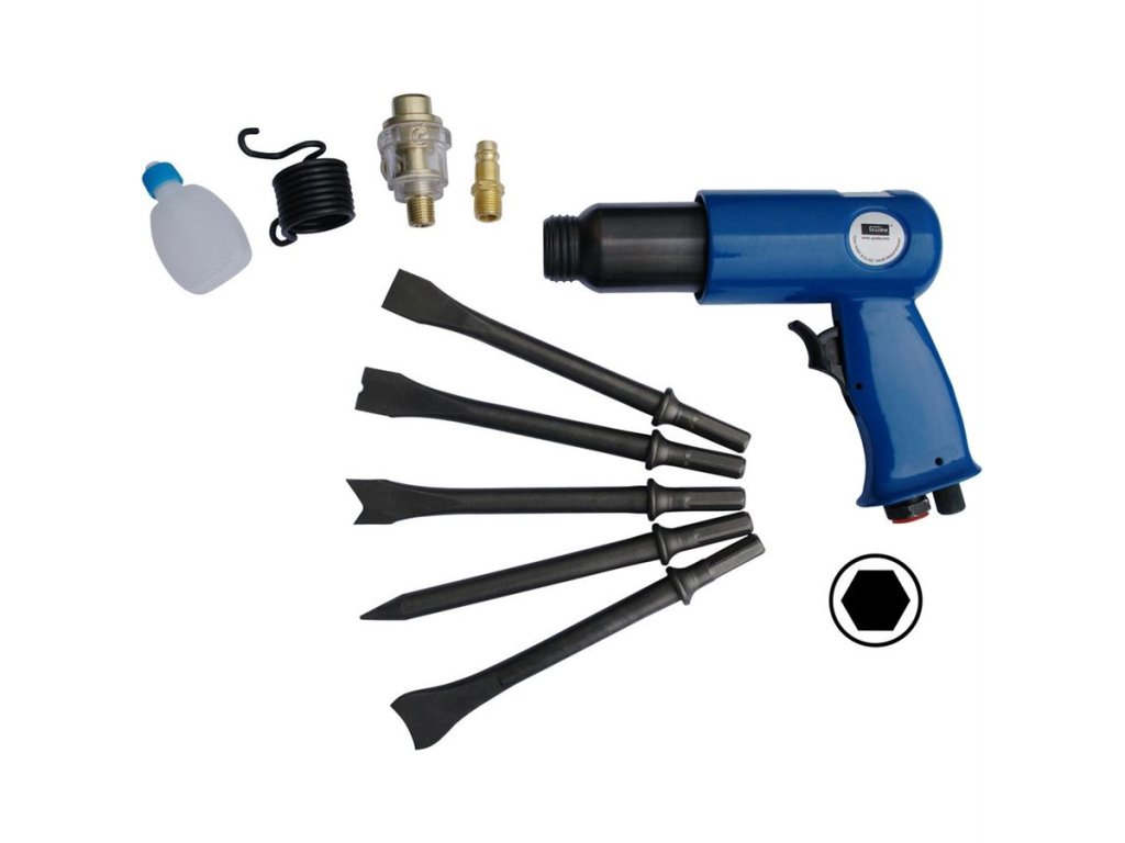 Složení sady: sekáče 175 mm (5x), přídržná pružina, mlhový přimazávač, vsuvka 1/4'', olejnička, plastový transportní kufřík.