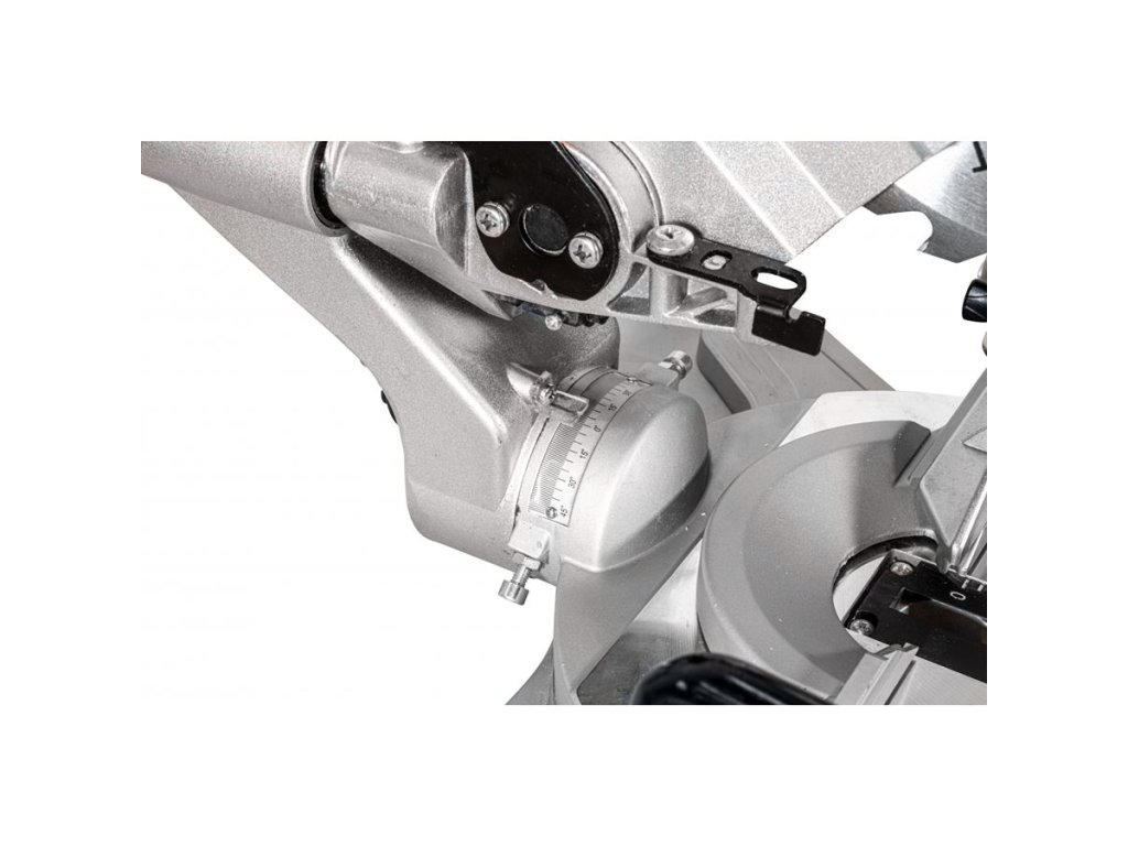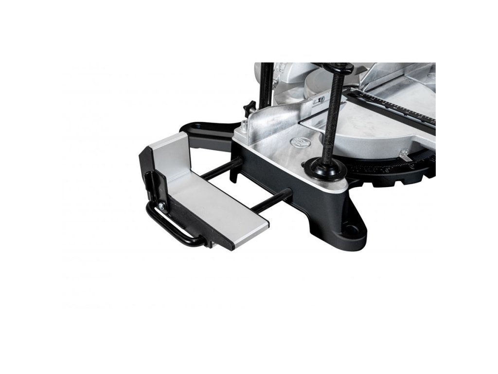 Laserový ukazatel linie řezu • výsuvné opěrky pro řezání rozměrných obrobků • otočný pracovní stůl s úhlovou (centimetrovou) stupnicí.