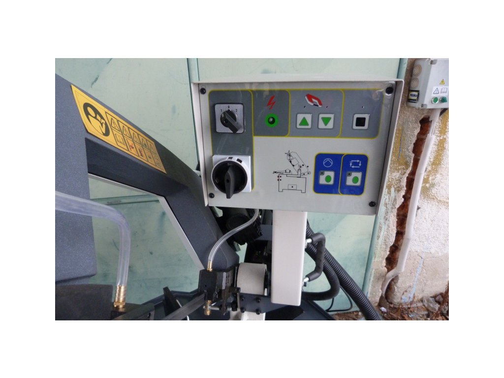 Přítlak do řezu je zajištěn hmotností ramene pásové pily s hydraulickou regulací rychlosti. Chladící zařízení v podstavci, nastavitelný délkový doraz patří ke standardní výbavě pásové pily.