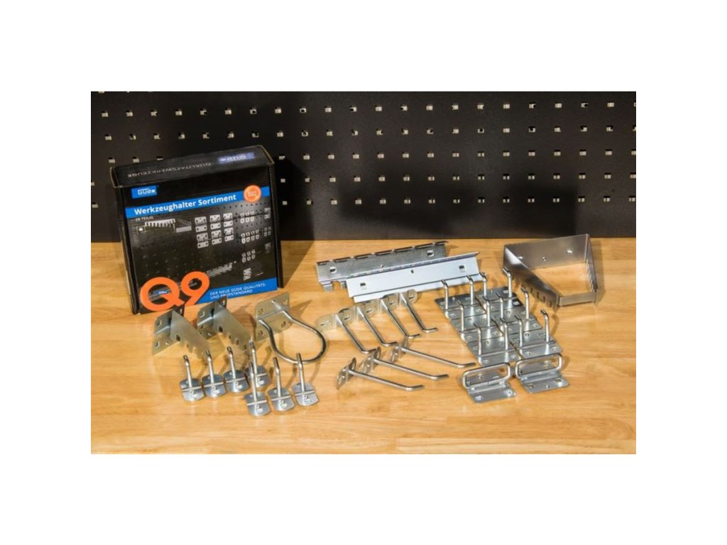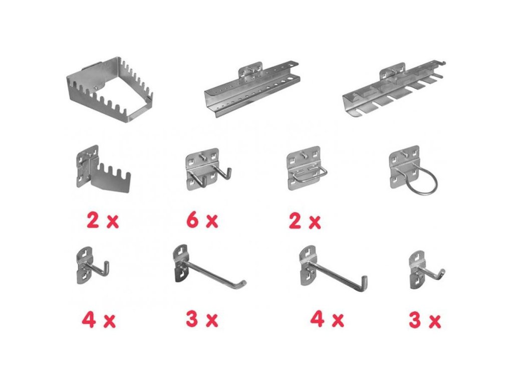 Sada 28 háků a držáků, kompatibilní s dílenskými závěsnými systémy, které využívají čtvercové děrování 10 mm2 při vertikální/horizontální vzdálenosti středů otvorů 38 mm.