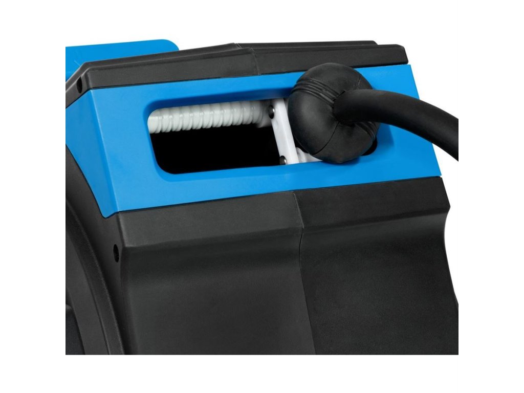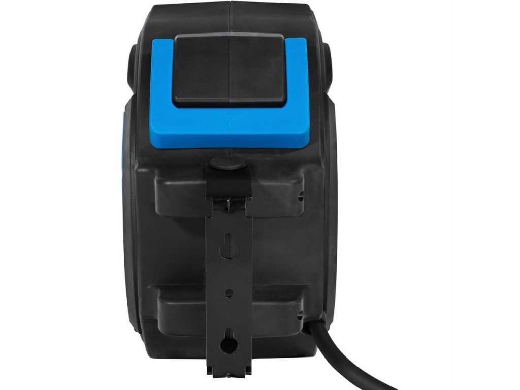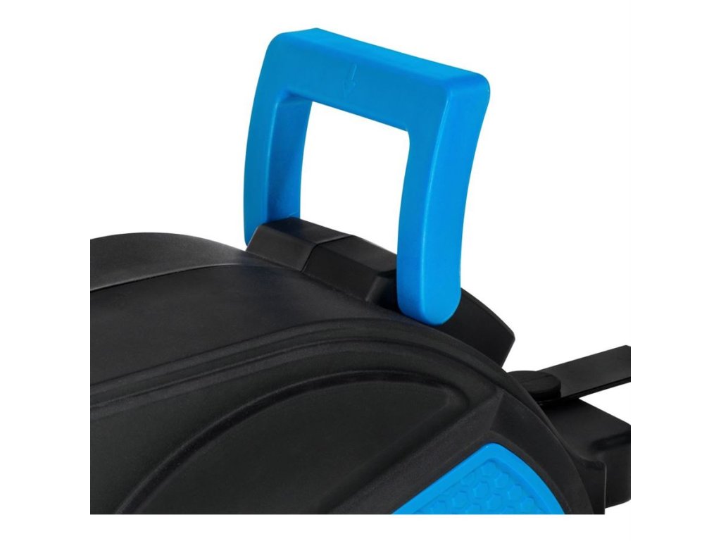 Nárazuvzdorné plastové pouzdro s praktickou rukojetí je otočné až o 180° na obě strany a s 15 metrů dlouhou a inovativní speciální hadicí se směsí pryže a PVC snadno dosáhnete na jakoukoli pracovní plochu v tomto okruhu.