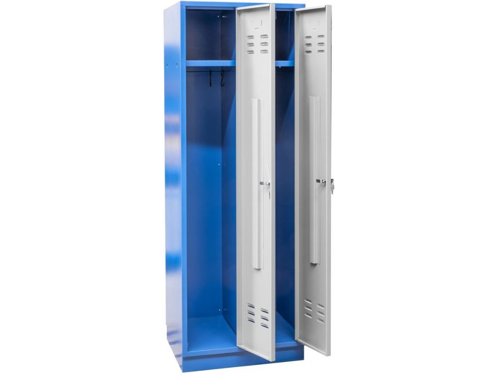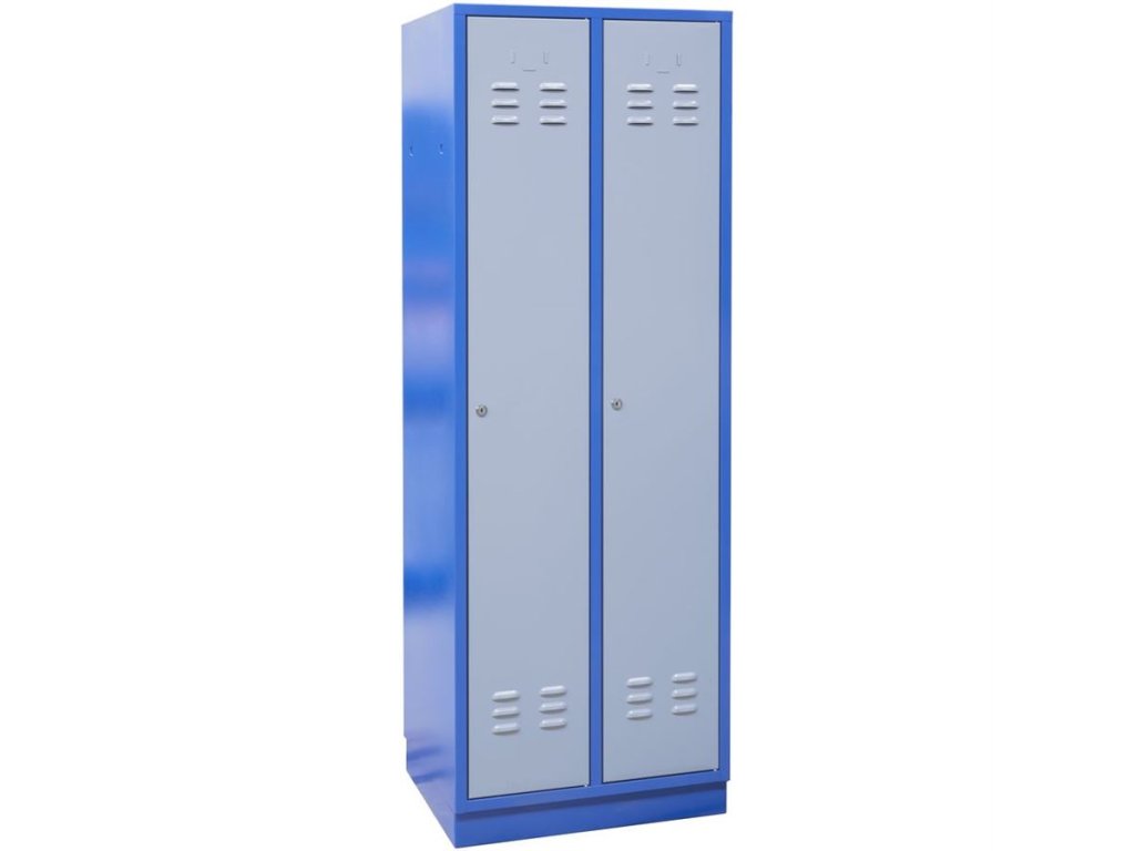 Dvoukomorová šatní skříň s univerzálním využitím ve výrobní i nevýrobní sféře (-> školní šatny, sportovní kluby, servisní dílny, výrobní provozy apod.).