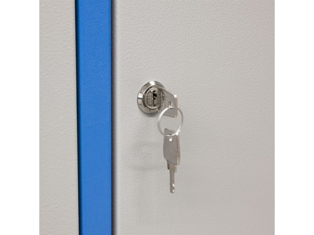 Vybavení: dvoudveřová skříň (-> uzamykání cylindrickými zámky, 2/2 klíče); zesílené dveře (-> vnitřní výztuže), vrchní/spodní odvětrávací štěrbiny, integrované rámečky na jmenovky.