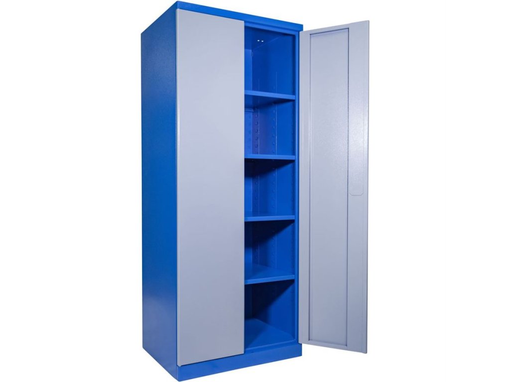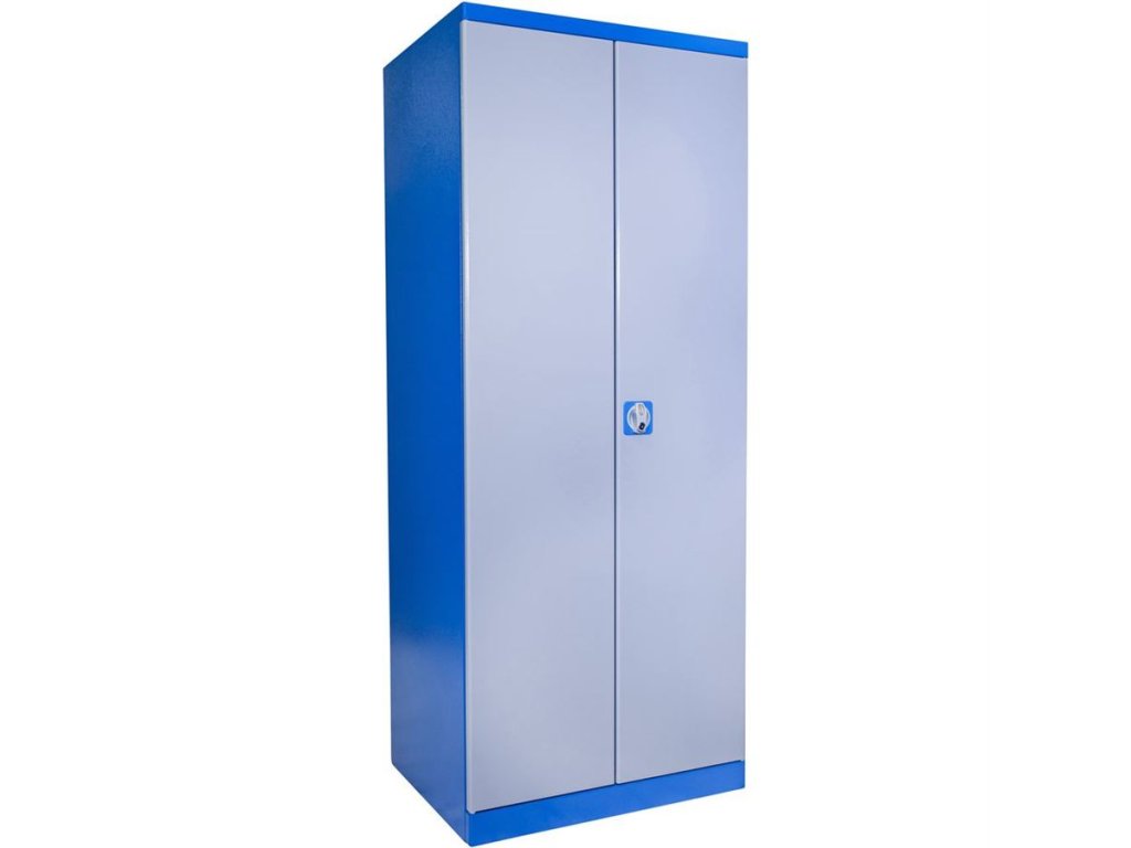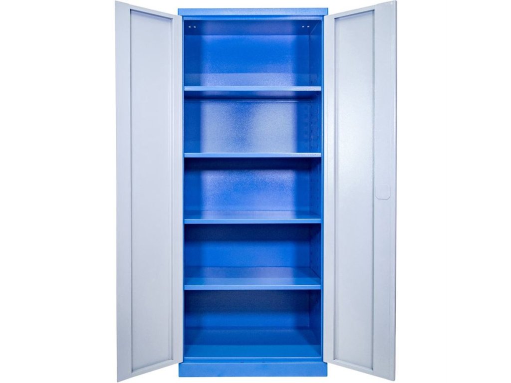 Vybavení: dvoudveřová skříň (-> uzamykání cylindrickým/rozvorovým zámkem - dvojité uzamčení, 2 klíče); čtyři vyjímatelné police (-> volitelné nastavení výšky, nosnost: 50 kg).