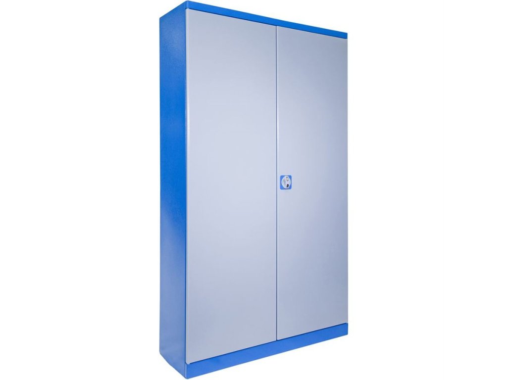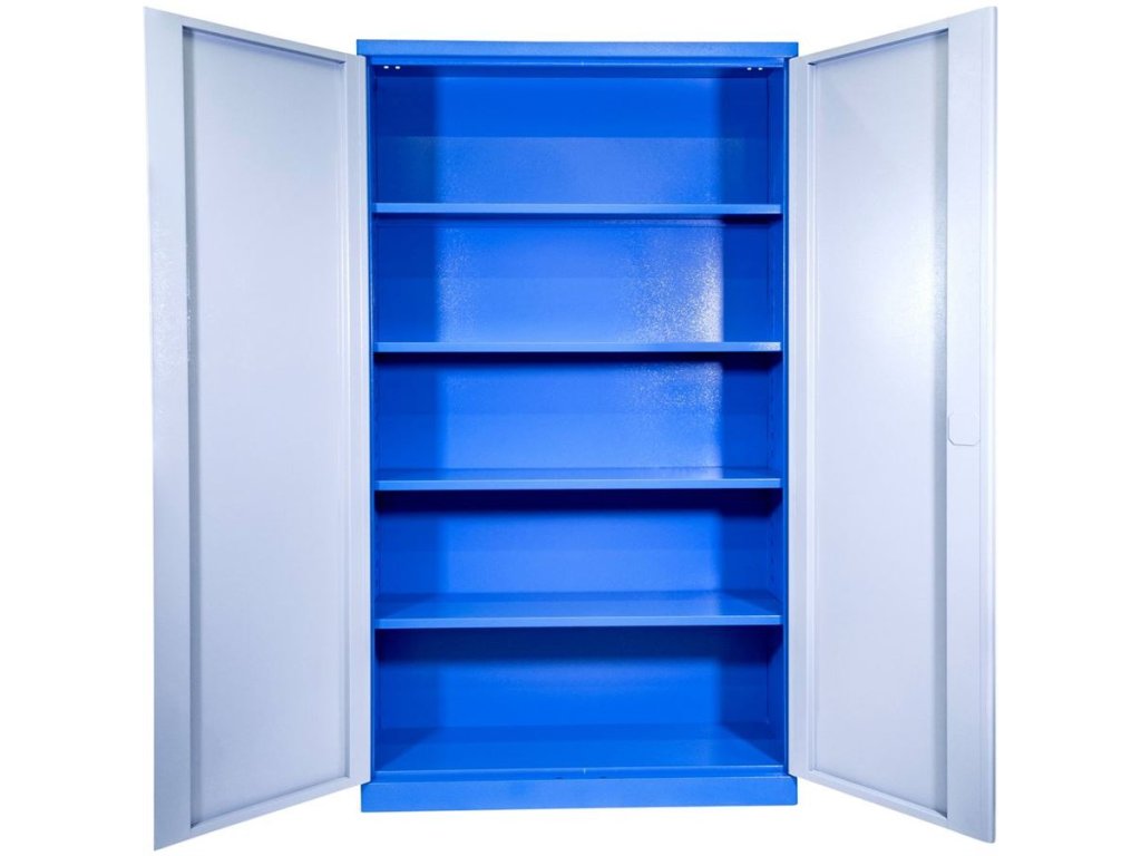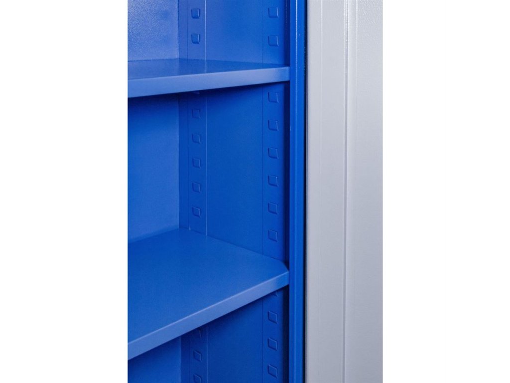 Vybavení: dvoudveřová skříň s uzamykáním cylindrickým/rozvorovým zámkem (-> dvojité uzamčení, 2 klíče); čtyři vyjímatelné police (-> volitelné nastavení výšky, nosnost: 50 kg).