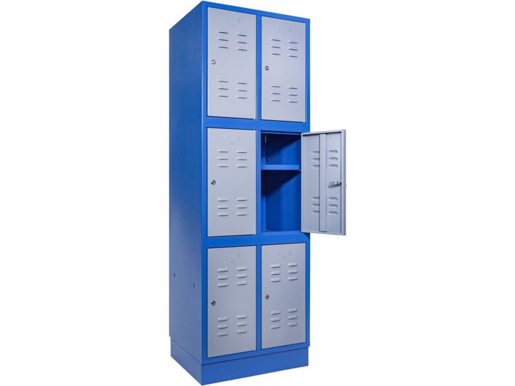 Vybavení: šestidveřová skříň; zesílená dvířka (-> vnitřní výztuže); očka pro uzamykání visacími zámky; odvětrávací štěrbiny; integrované rámečky na jmenovky.