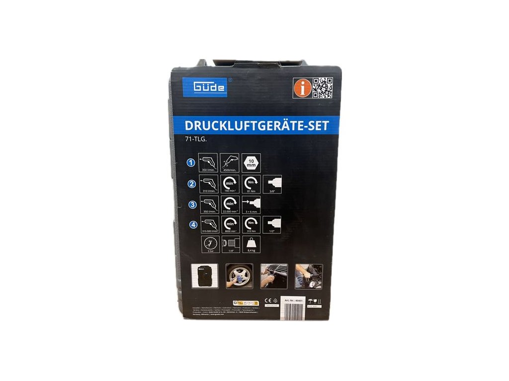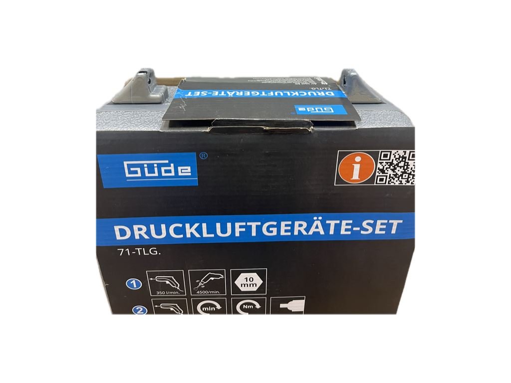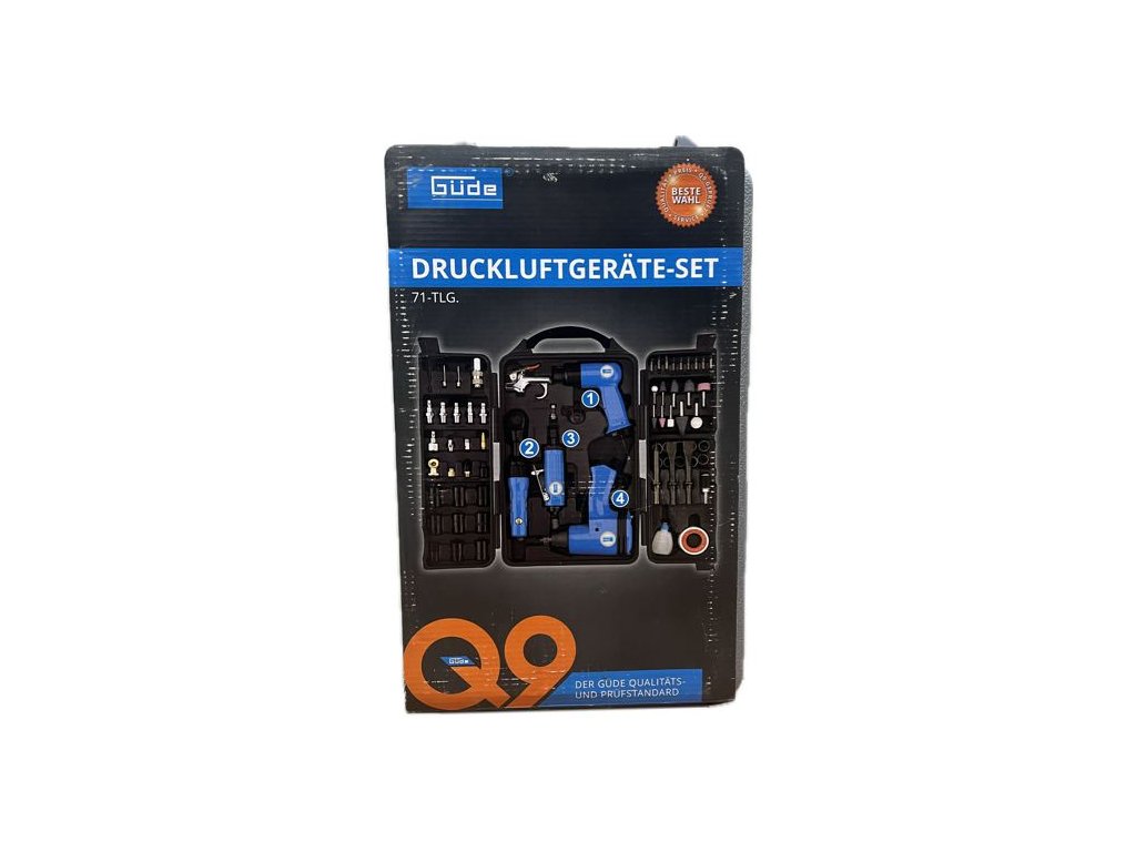 71-dílná sada pneumatického nářadí s příslušenstvím GÜDE, zahrnující základní vybavení dílny, provozované na stlačený vzduch.