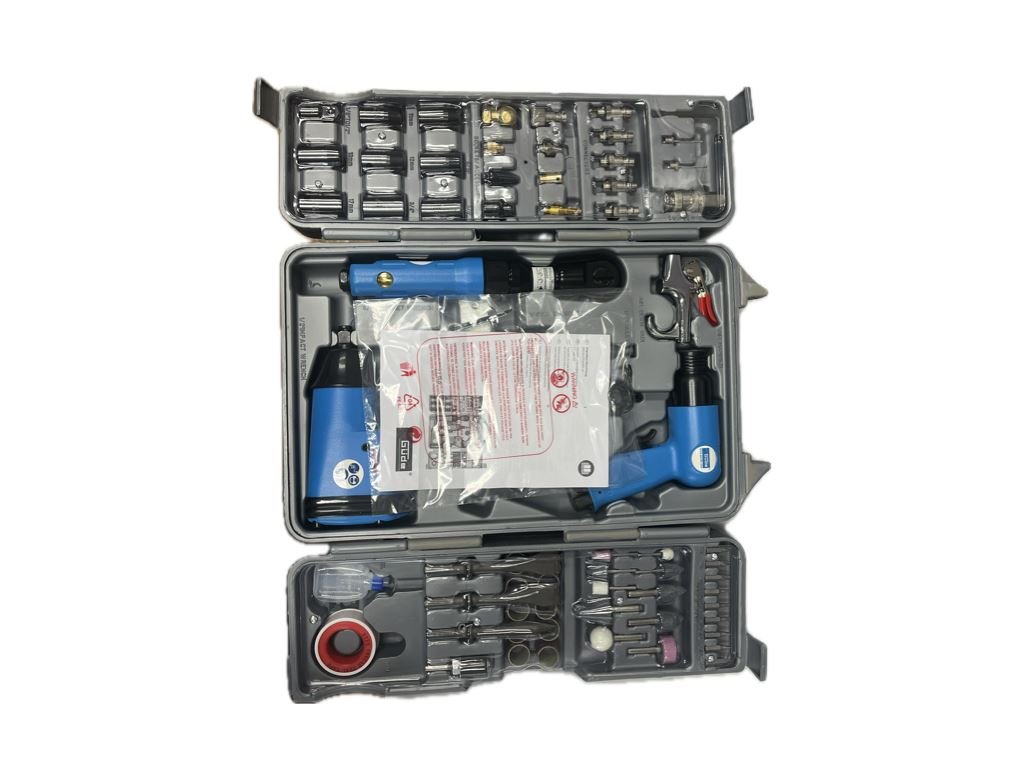 Příslušenství: sada nástrčných klíčů (8), sada sekáčů (3) včetně přídržné pružiny, upínací kleština 3 mm, brusné kolíky 6 mm (3), brusné kolíky 3 mm (3), brusné válečky (10),vsuvky 1/4'', transportní plastový kufřík, přizpůsobený pro montáž na stěnu