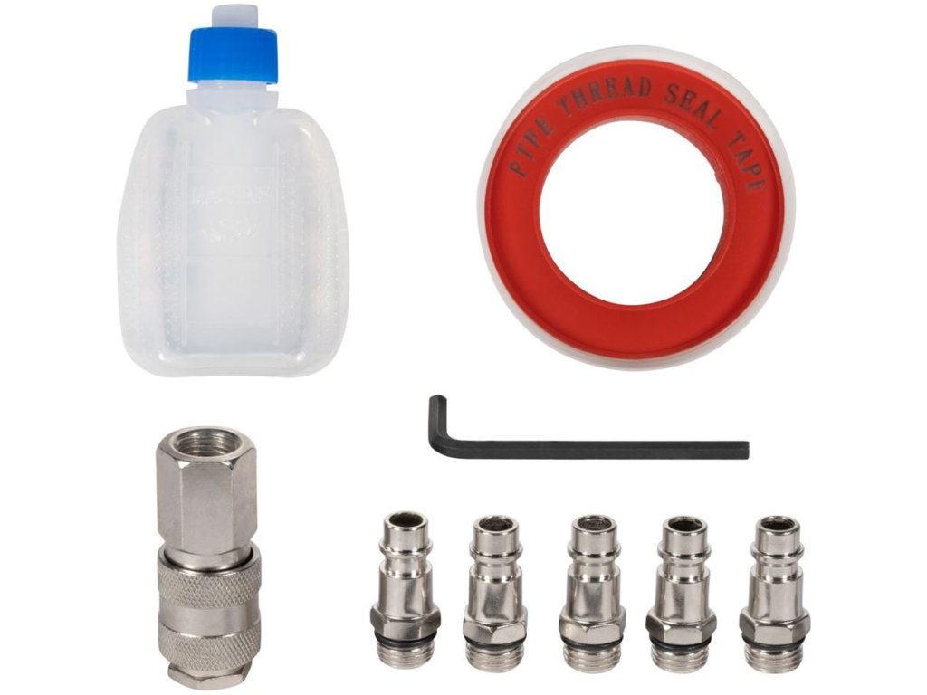 Příslušenství: sada nástrčných klíčů (8), sada sekáčů (3) včetně přídržné pružiny, upínací kleština 3 mm, brusné kolíky 6 mm (3), brusné kolíky 3 mm (3), brusné válečky (10),vsuvky 1/4'', transportní plastový kufřík, přizpůsobený pro montáž na stěnu