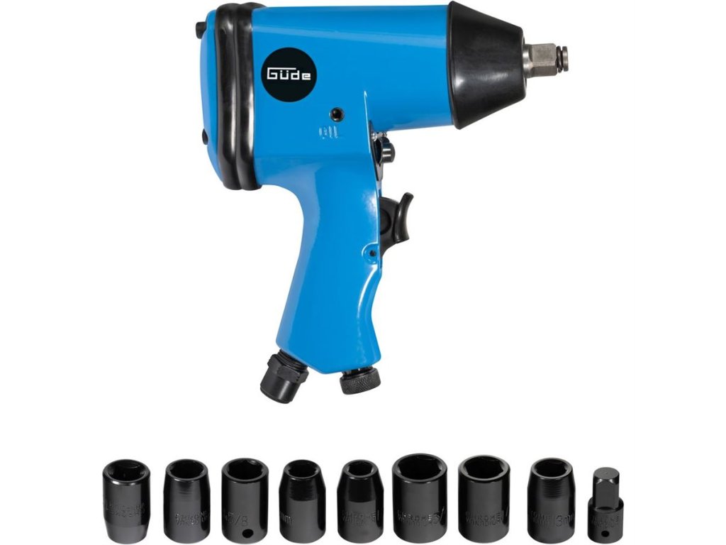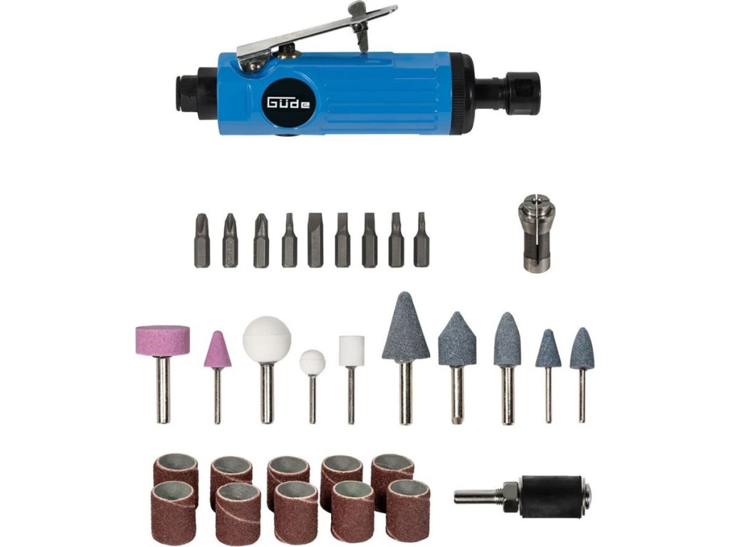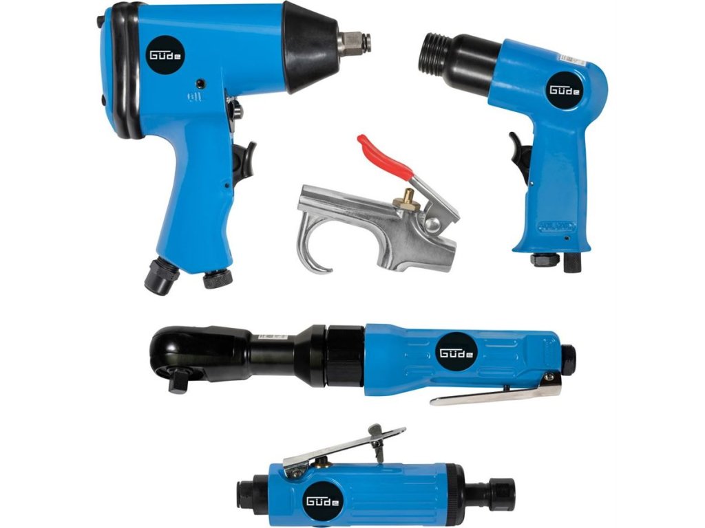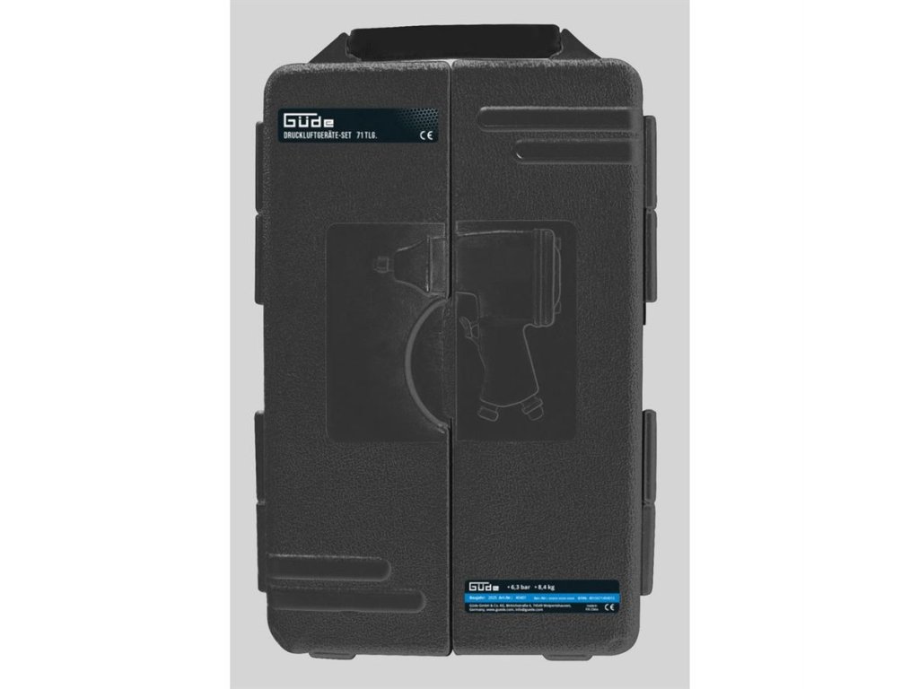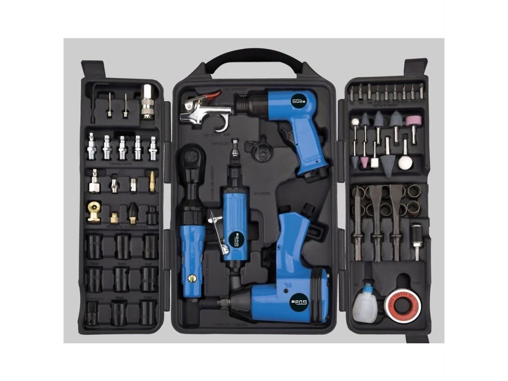 71-dílná sada pneumatického nářadí s příslušenstvím GÜDE, zahrnující základní vybavení dílny, provozované na stlačený vzduch.