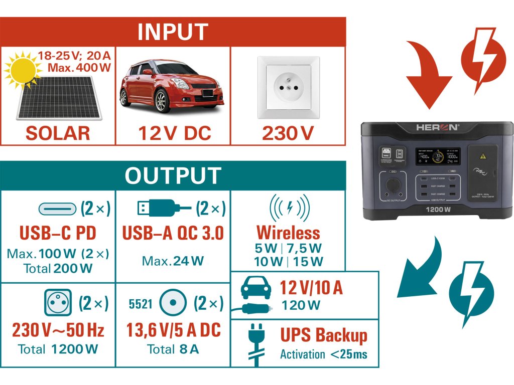 | USB-C výstup | PD max.100 W (2×), 5V–9V–12V–15V/3A, 20V/5A, celkem max. 200W |