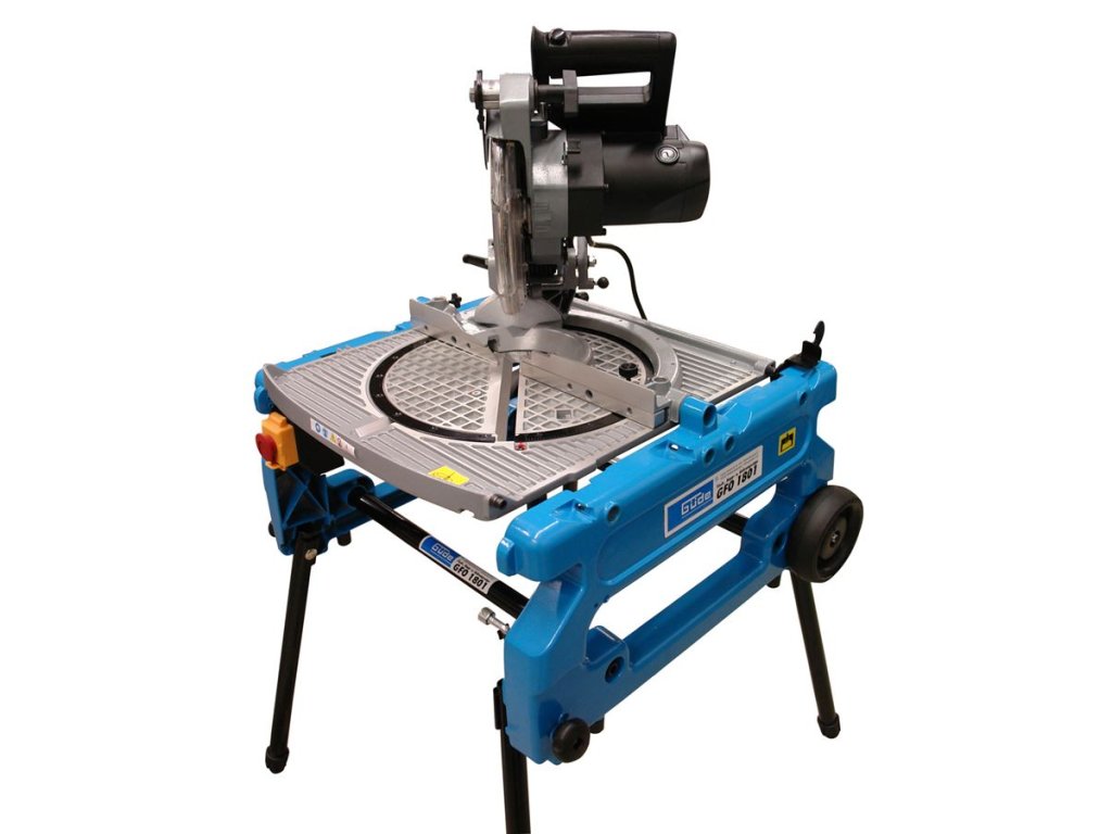 Motor 1.800 W/P1, bezpečnostní spínač. Konstrukce: robustní litinový rám s transportními kolečky, hliníkový pracovní stůl (-> 558 x 500 mm), ochranný kryt pilového kotouče, přípojka odsávání/sběrný pytlík, podélný/úhlový doraz, rychloupínací svěrka obrobku, výklopné stojné nohy.