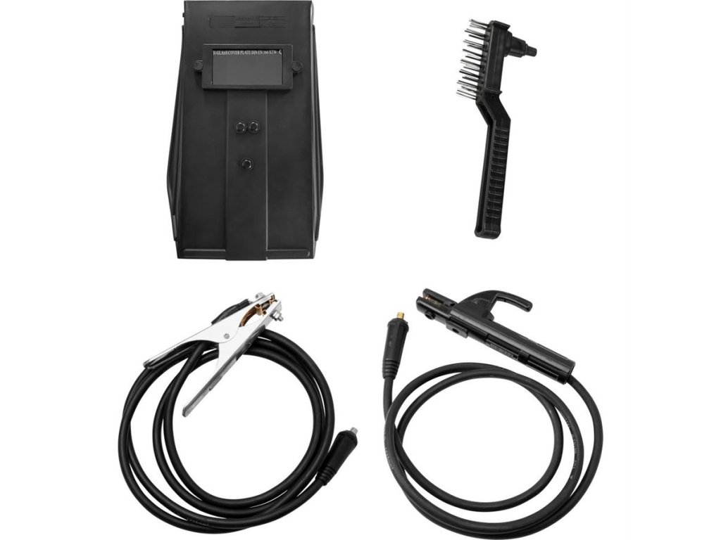 Výrobek obsahuje: svářecí kabel s držákem elektrod, kabel se zemnicí svorkou, drátěný kartáč s kladívkem na strusku, štít.