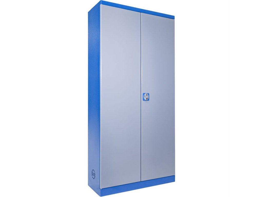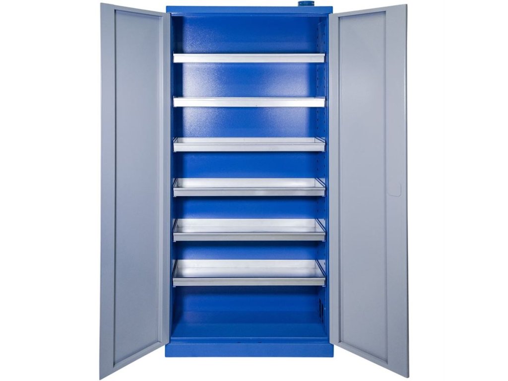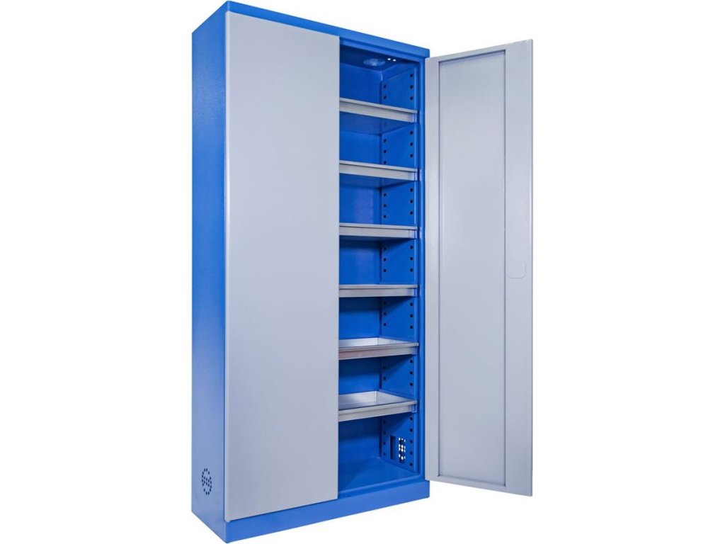 Kovová skříň, atestovaná pro bezpečné skladování hořlavých nebo jedovatých látek v podmínkách servisních dílen, výrobních provozů apod.
