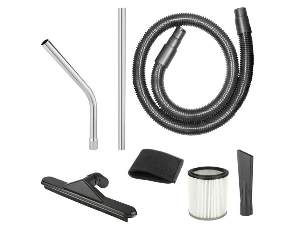 Vysavač na mokré/suché vysávání, 1,5 m sací hadice, 2dílná kovová sací trubka, 1 podlahová hubice, 1 štěrbinová hubice, 1 pěnový filtr, 1 HEPA filtr