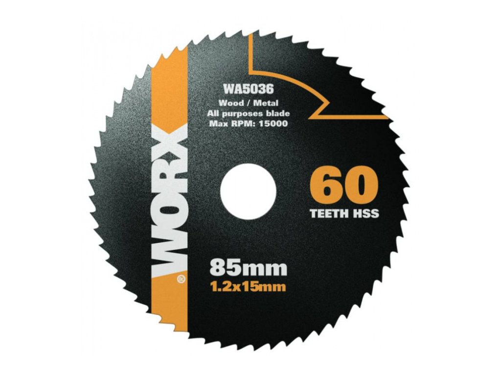 WA5036 - Pilový kotouč na dřevo HSS s 60 zuby, o průměru 85 mm, se hodí k řezání dřeva, PVC a hliníku. Je kompatibilní s modely Worxsaw WX423, WX426 a WX523.