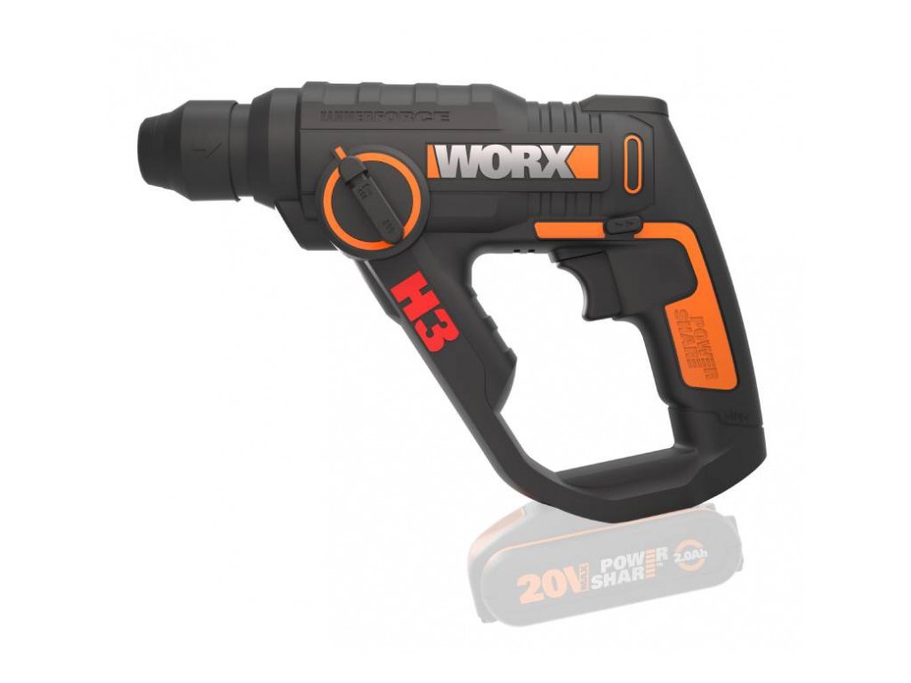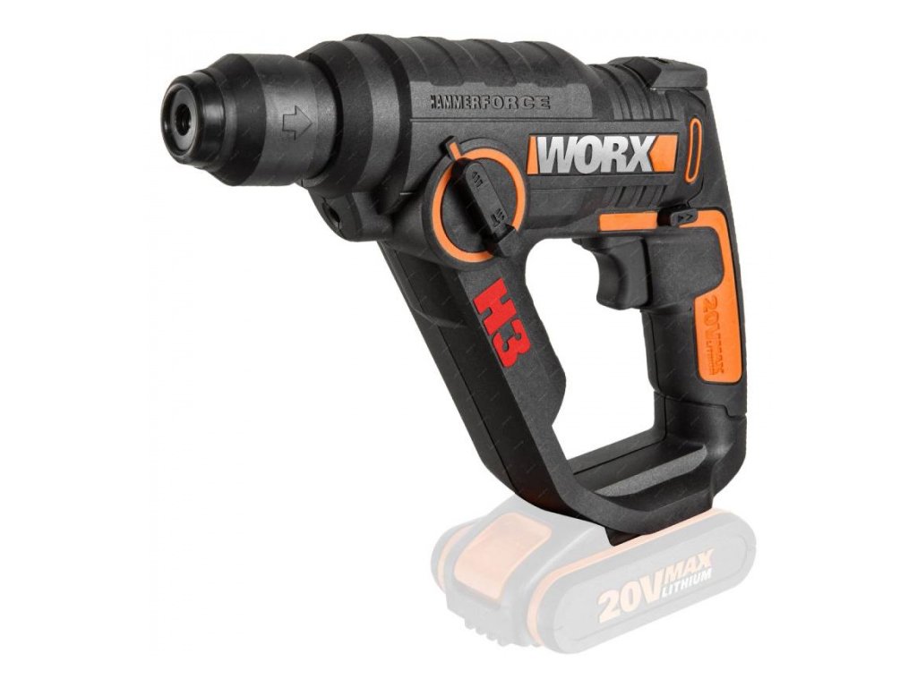 WX390.9 - Aku vrtací kladivo Mechanismus tohot pneumatického vrtacího kladiva poskytuje působivou energii příklepu 1,2 J pro rychlé vrtání do vyztuženého betonu. Worx H3 o velikosti standardní akumulátorové vrtačky je překvapivě lehký a kompaktní pro svůj výkon, díky čemuž je ideální pro práci nad hlavou a další kritické aplikace, kde by bylo použití konvenčních síťových vrtacích kladiv nepohodlné a těžké.