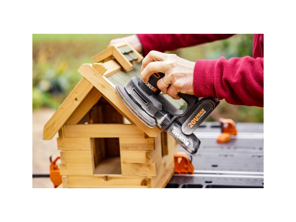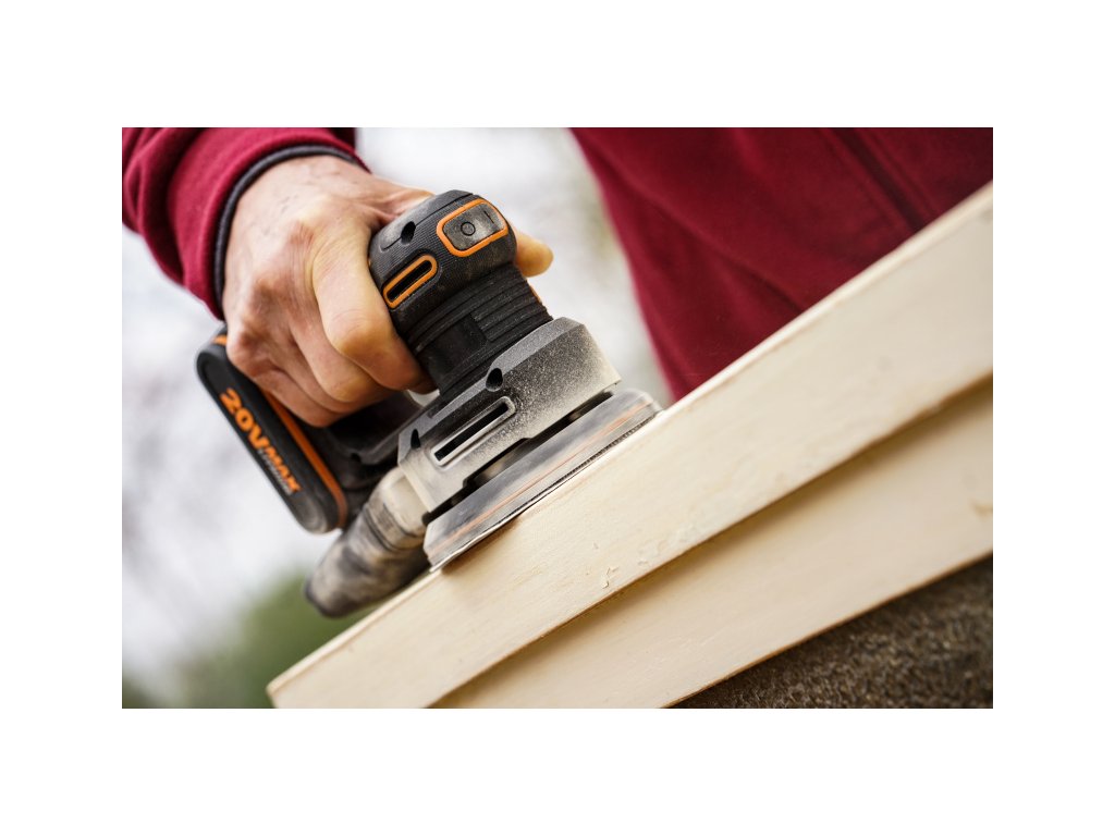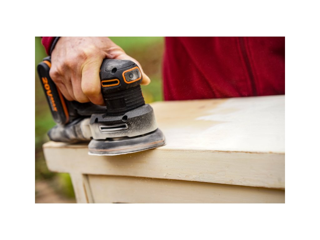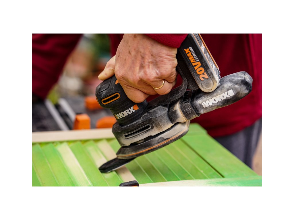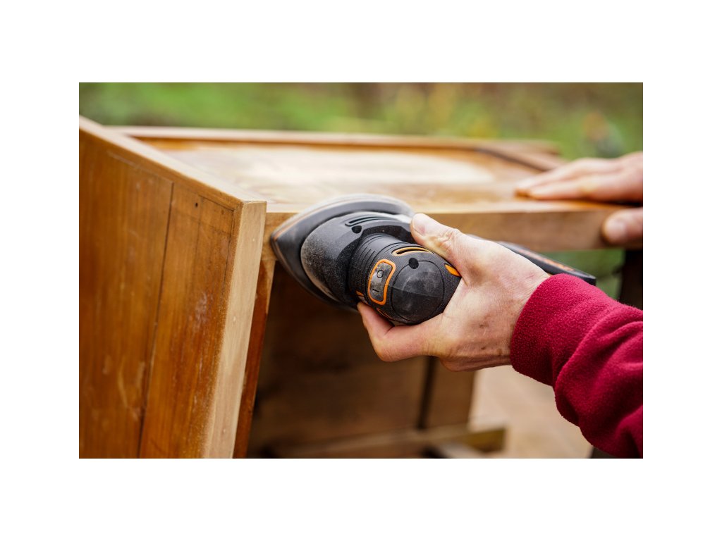 WX822.9 - Aku vibrační bruska je vybavena deskou ve tvaru žehličky na práci v těsných rozích a na okrajích a obdélníkovou deskou na střední až velké rovné plochy. Elektronická předvolba otáček zajišťuje správné nastavení rychlosti pro danou práci a materiál. Bruska je ideální na práci se dřevem a nalakovanými a natřenými povrchy, jako je nábytek, dveře, rámy apod. Snadno odnímatelná mikrofiltrační nádoba na prach snižuje množství prachu a udržuje pracovní prostor v čistotě.