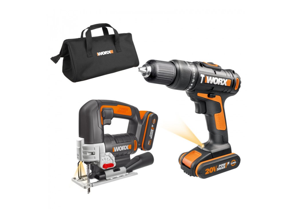 WX967 - Aku vrtačka s příklepem a aku přímočará pila 20V, 2x 2.0A - Powershare